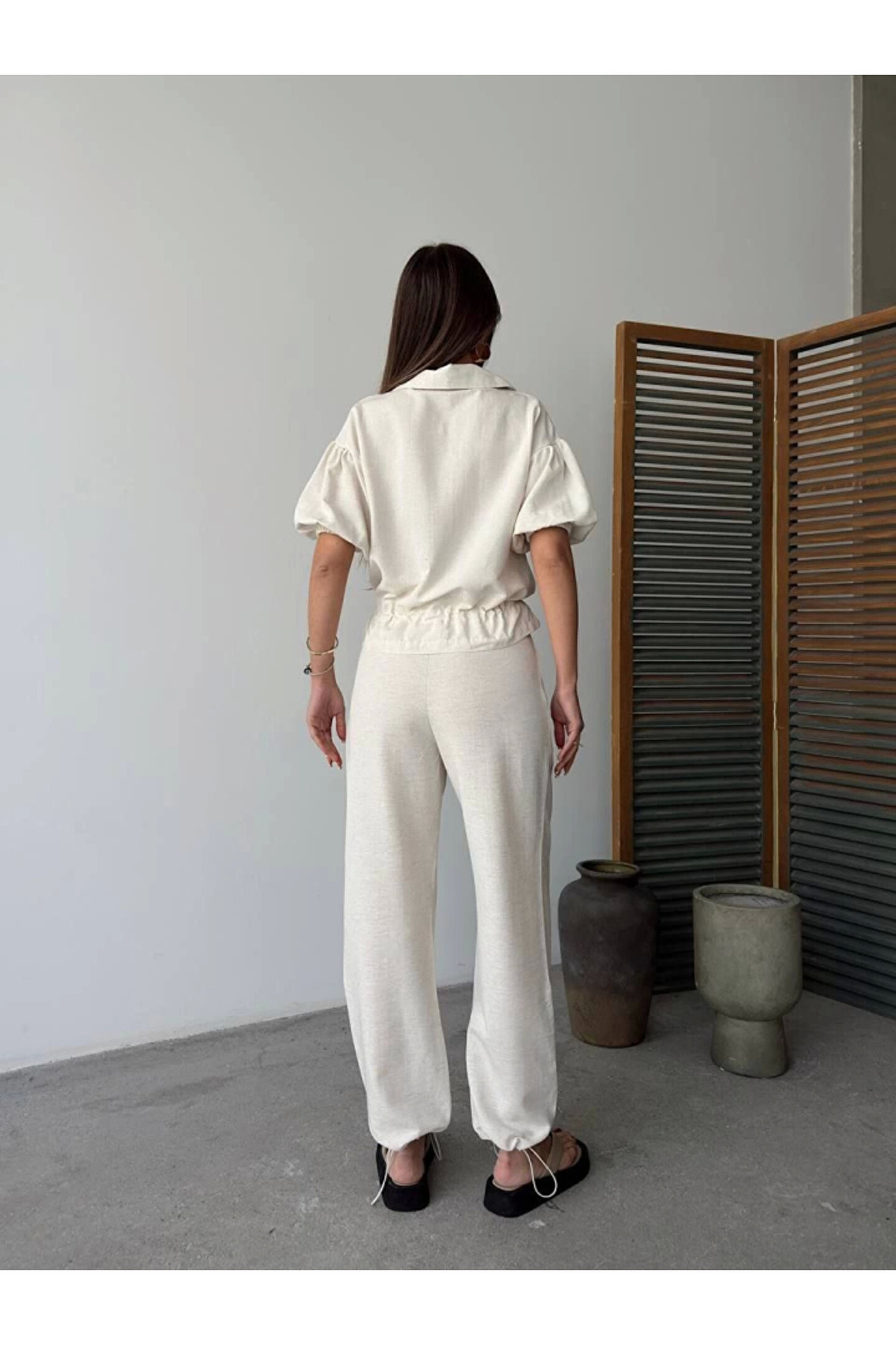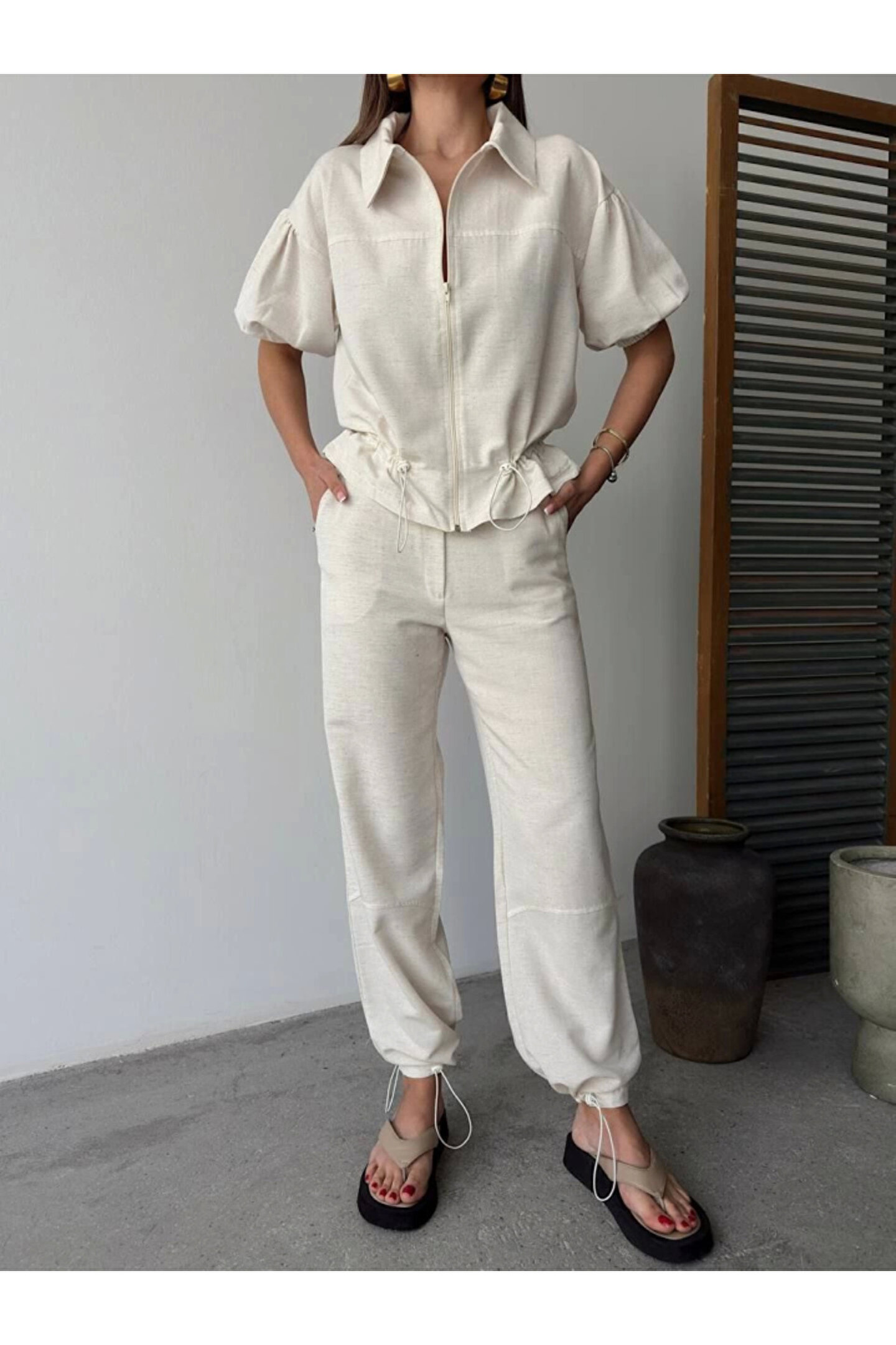 Keten Tam Fermuarlı Kısa Kollu Gömlek Pantolon Ikili Takım - Beyaz