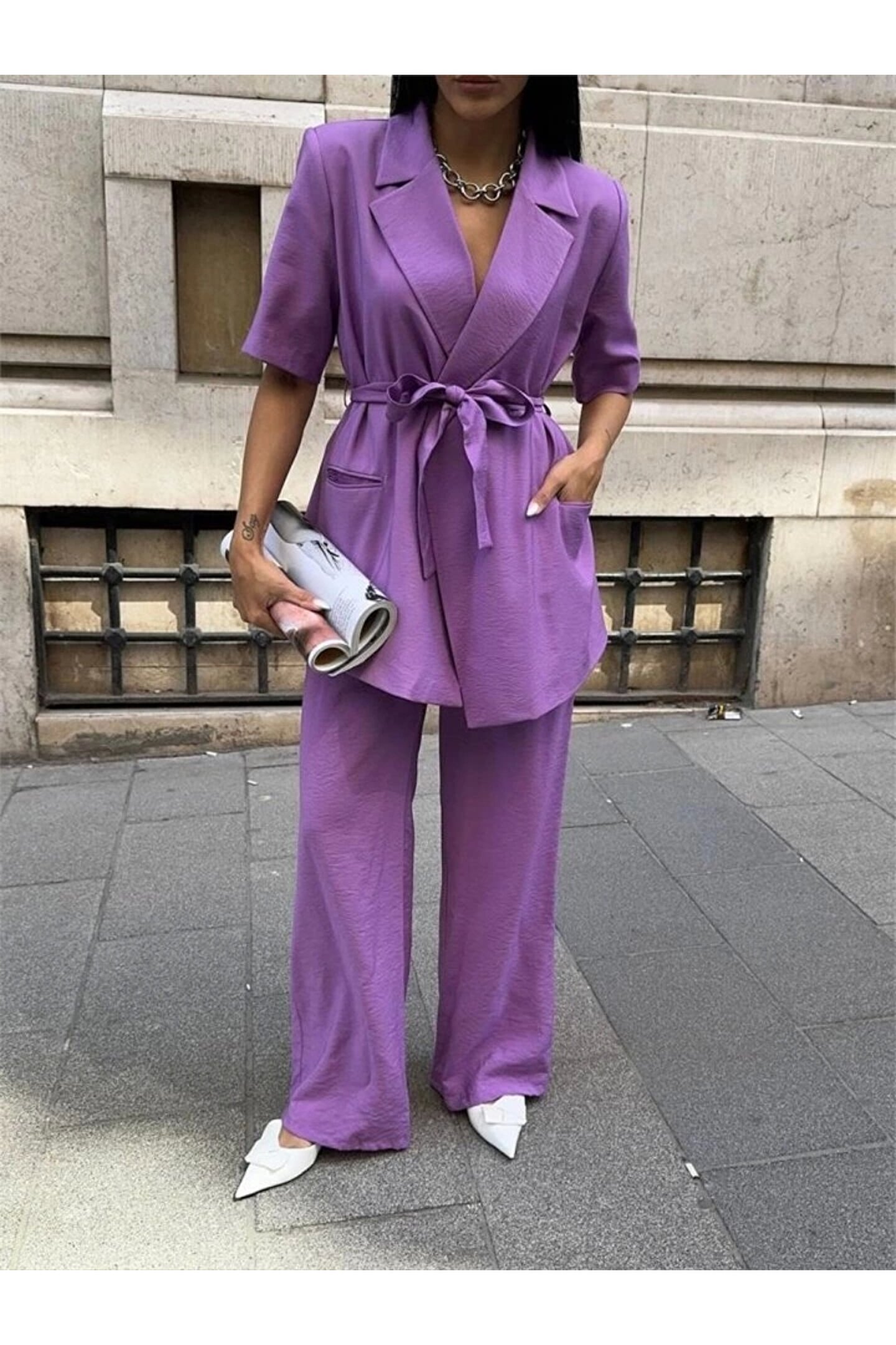 KISA KOL BAĞLAMA DETAYLI CEKET-PANTOLON TAKIM - Mor