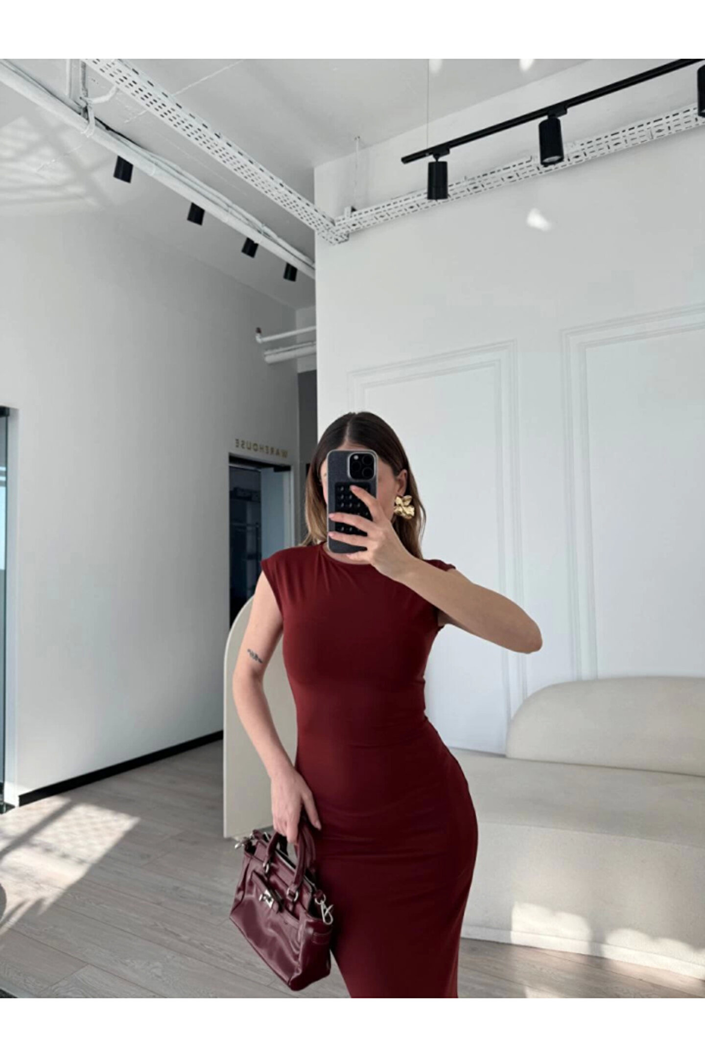 Kolsuz Uzun Likralı Elbise - Bordo