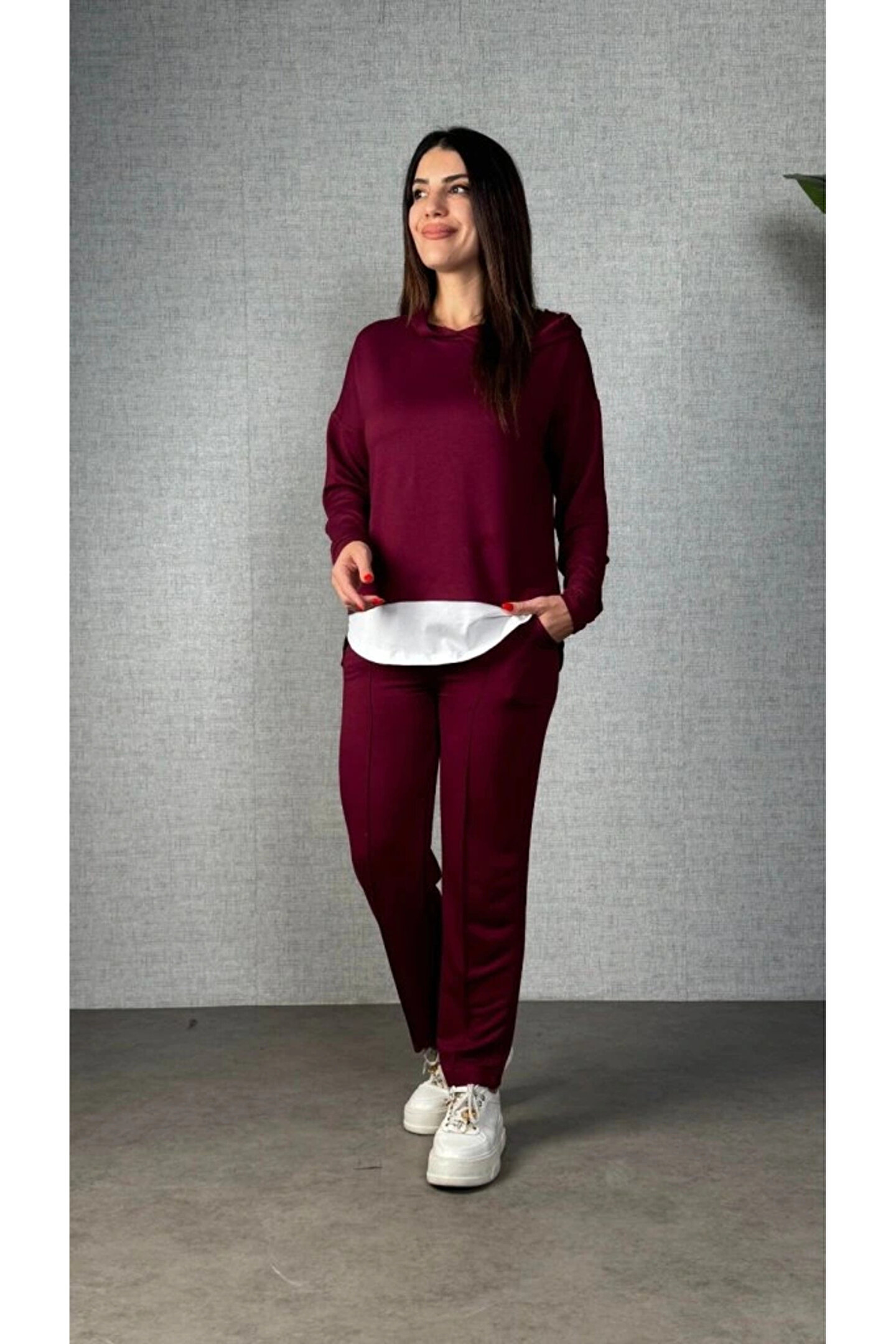 Silerra MDB Kadın Uzun Kollu Kapşonlu Bağcıklı Viskon Iki Iplik Bluz Ve Pantolon Ikili Takım