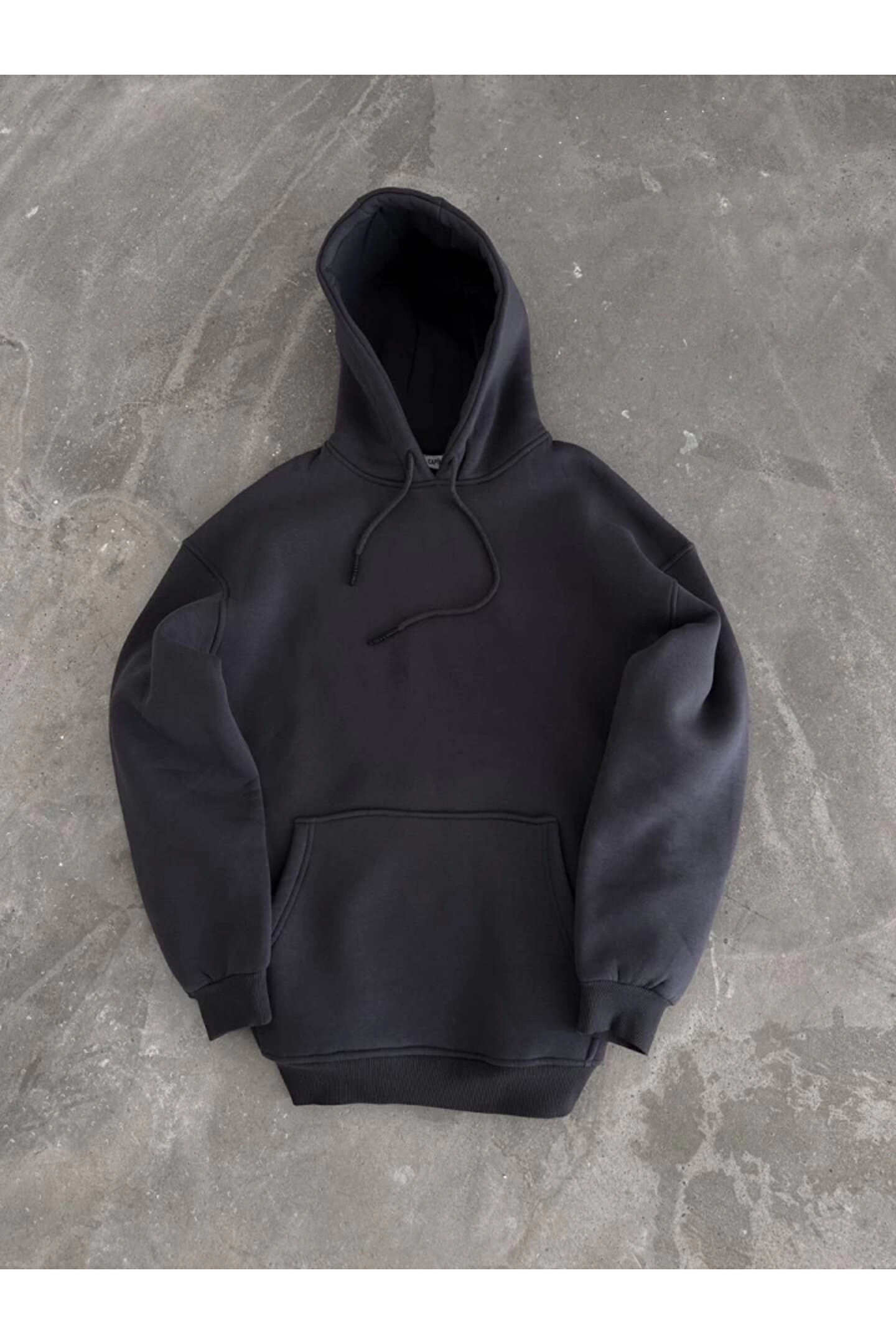 Kapşonlu Üç İplik Penye Basic SweatShirt - Füme