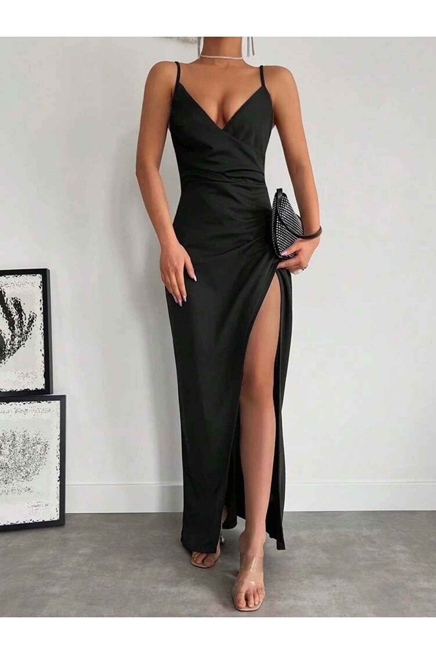 Kadın Askılı Kruvaze Yakalı Yırtmaçlı Krep Elbise