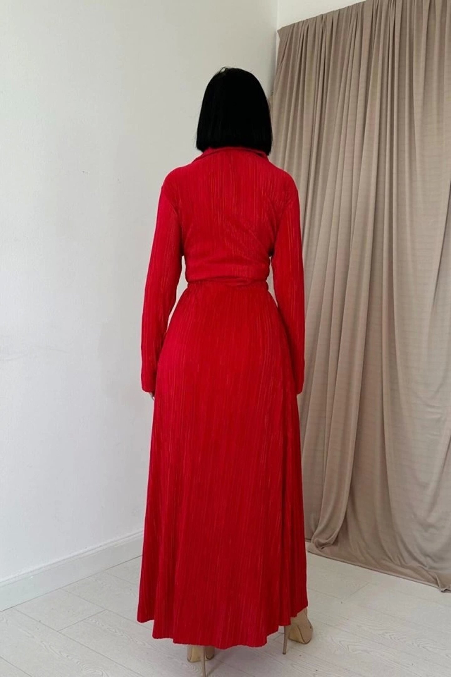 Kırmızı Fitilli Gömlek Ve Uzun Etek Takım