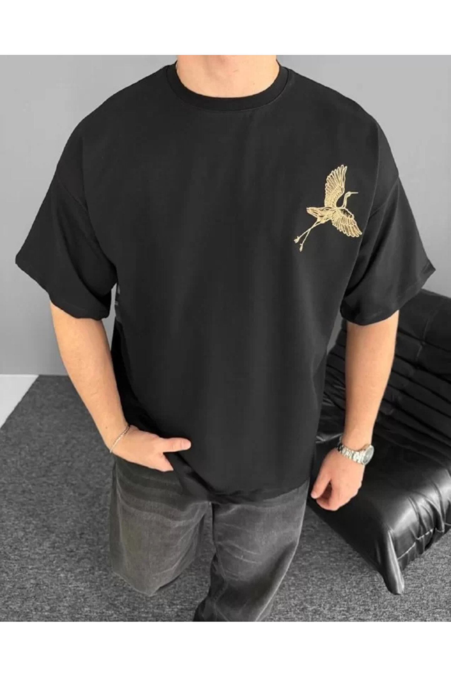 Ön Ve Arka Baskılı Oversize Bisiklet Yaka T-shirt - Siyah