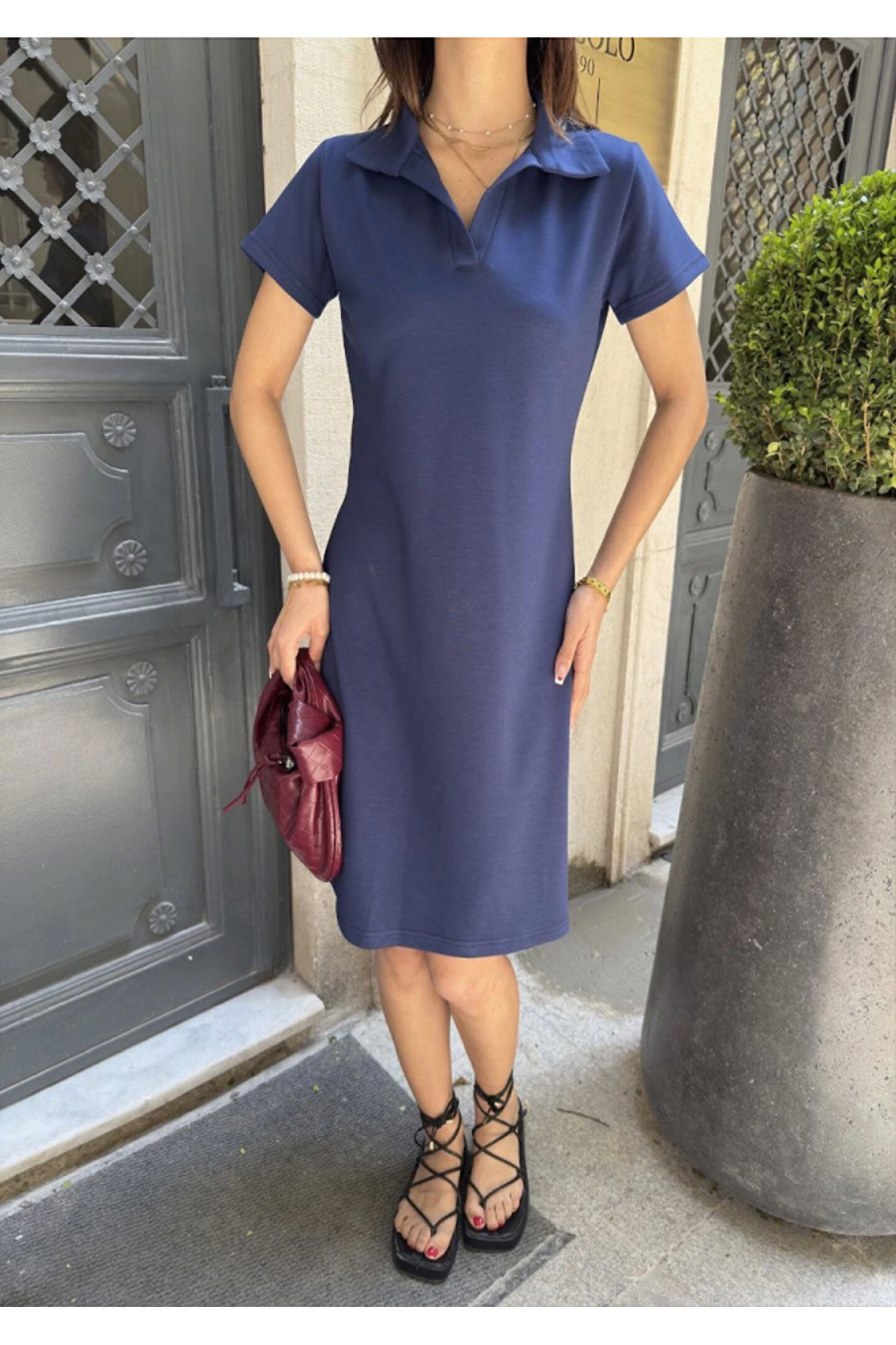 Osy Modal Yumuşak Dokulu Kumaş Yakalı Kısa Kollu Elbise - Mavi