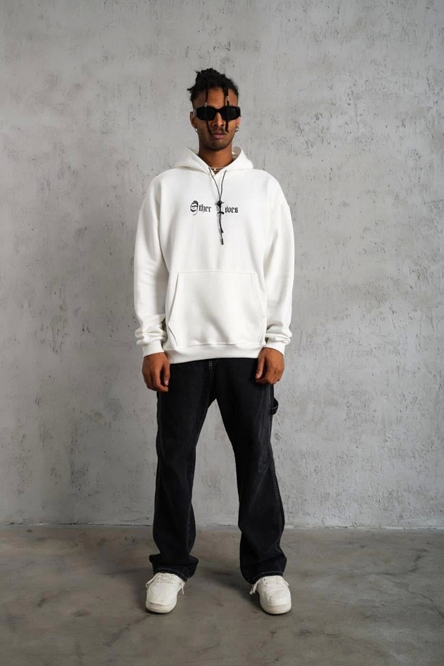 Oversize Üç İplik Şardonlu Kapüşonlu Sweatshirt – Beyaz “Other Lives” Ön Ve Arka Baskılı, Kanguru Cepli, Ribanalı Rahat Kışlık Model Beyaz