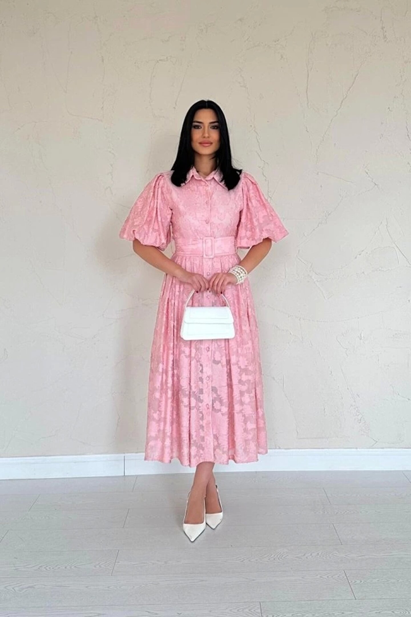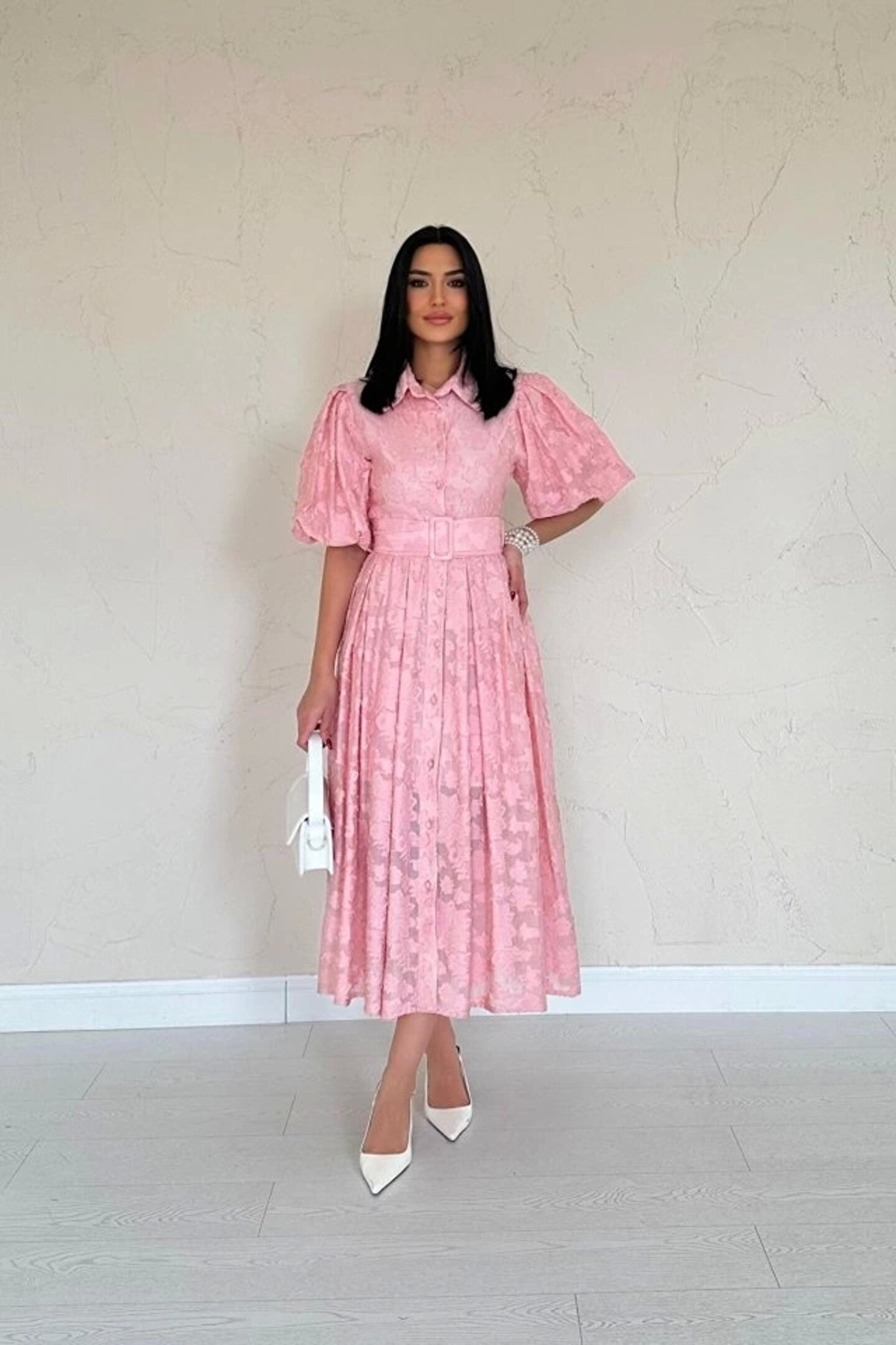 Silerra Pembe Kemerli Balon Kollu Elbise