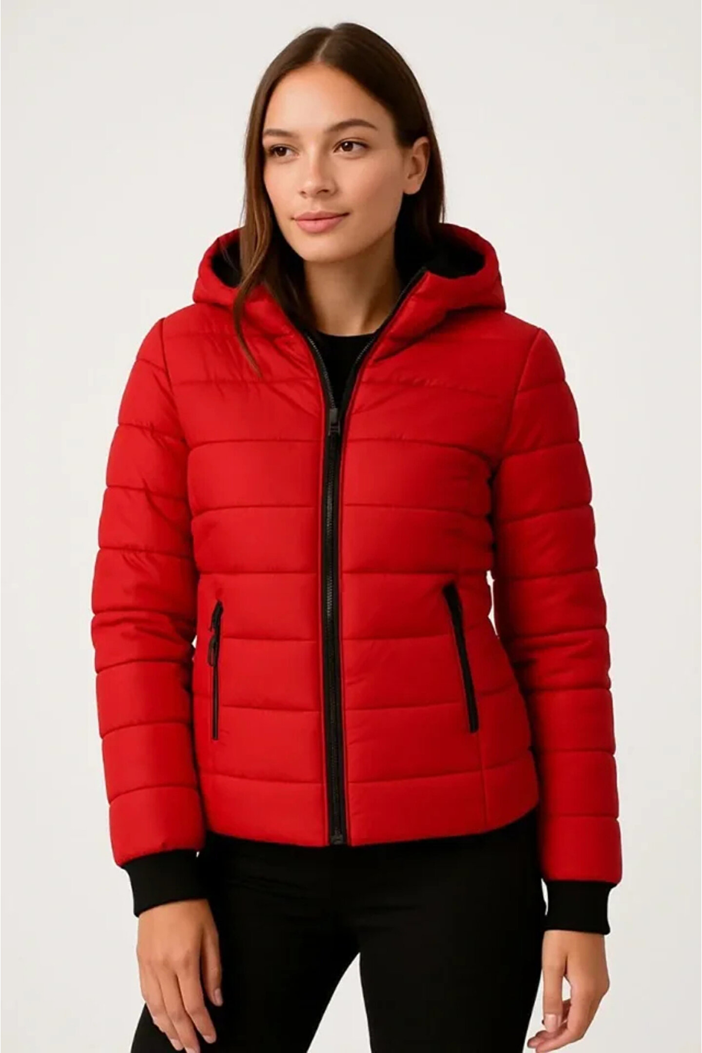 Şişme Kapüşonlu Fermuarlı Mont Su Itici Kapitone Astarlı Kumaş Cepli Kışlık Rahat Kalıp - Kırmızı