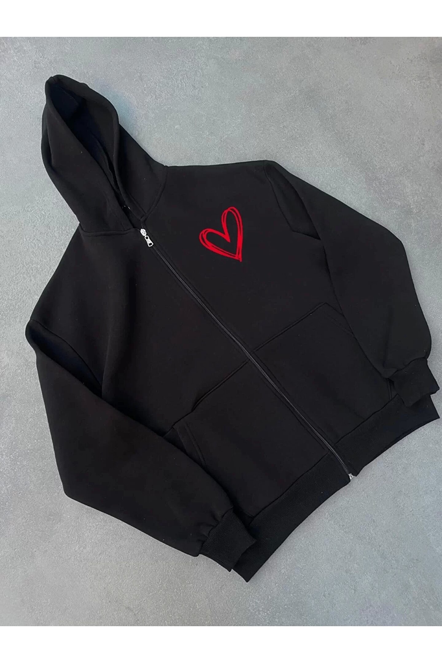 Silerra Üç İplik Baskılı Fermuarlı Kapüşonlu Hırka - Siyah