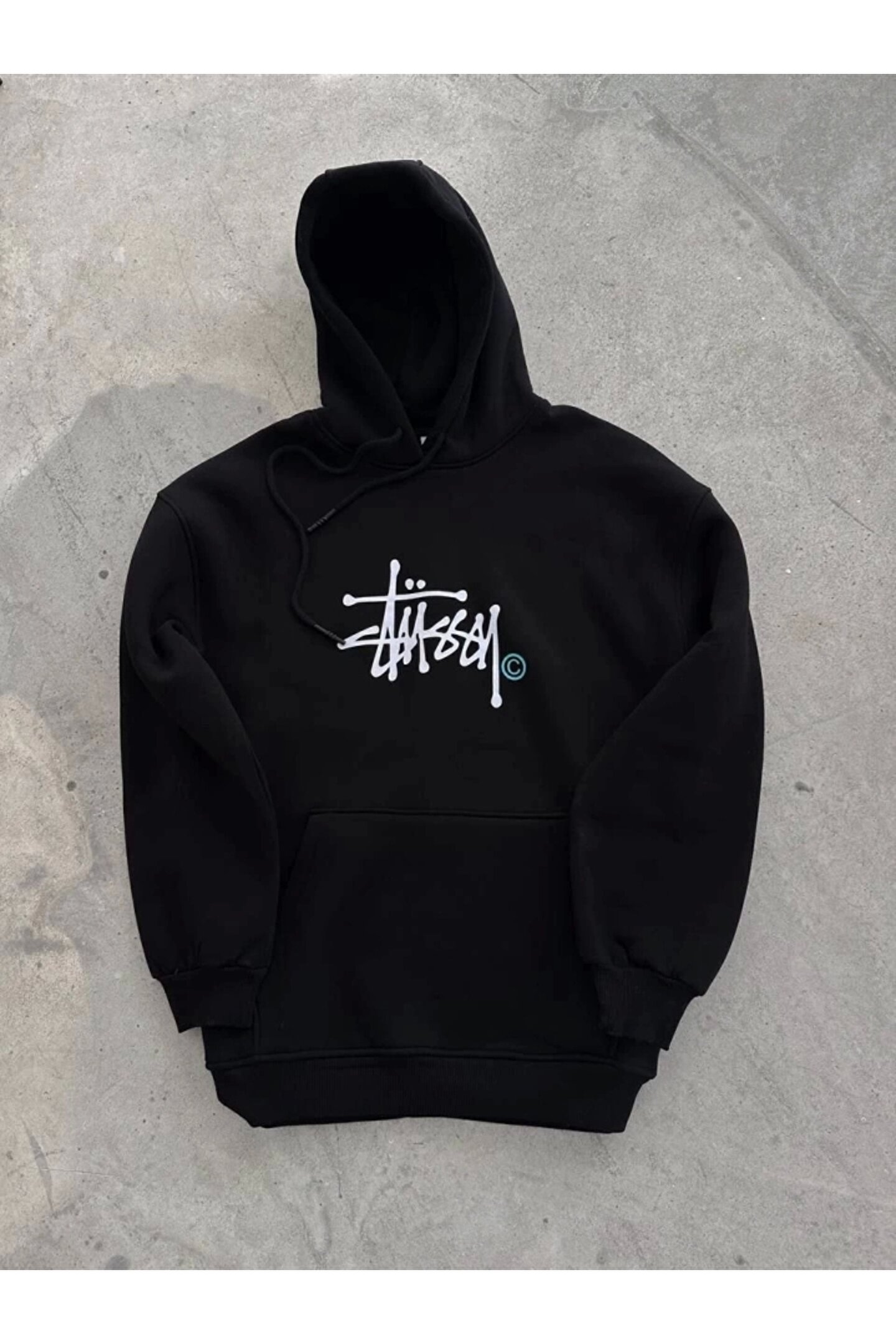 Üç İplik Kapşonlu Baskılı SweatShirt - Siyah