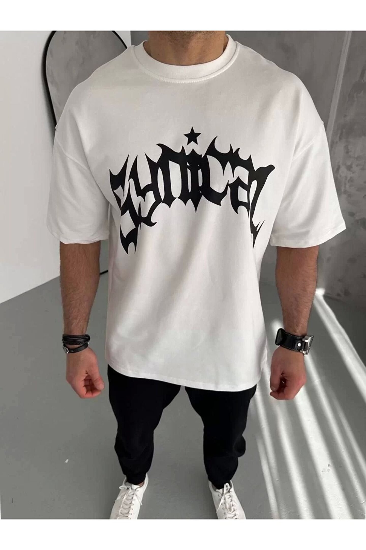 Silerra Unisex Bisiklet Yaka Baskılı Oversize T-Shirt - Beyaz