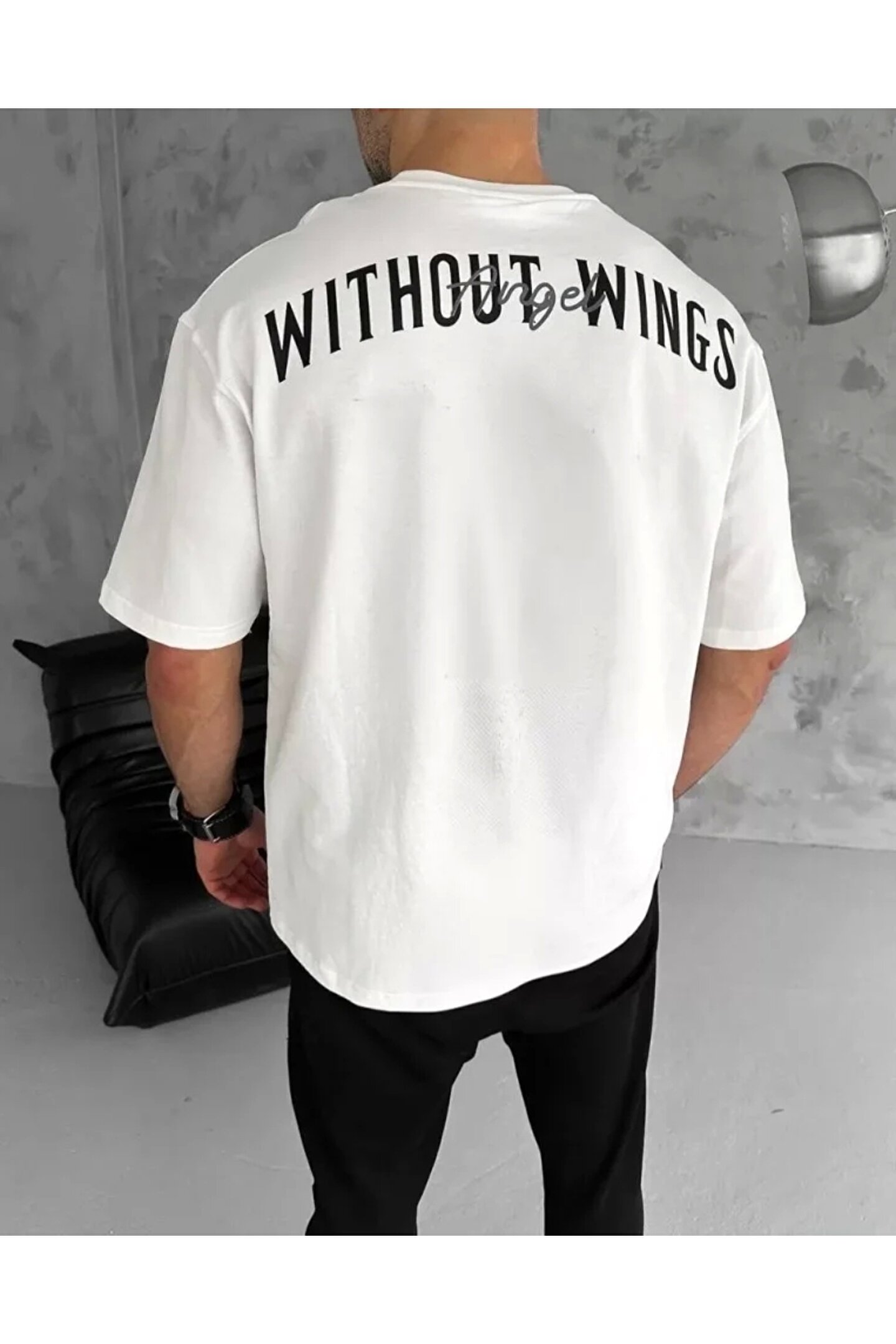 Unisex Bisiklet Yaka Baskılı Oversize T-Shirt - Beyaz