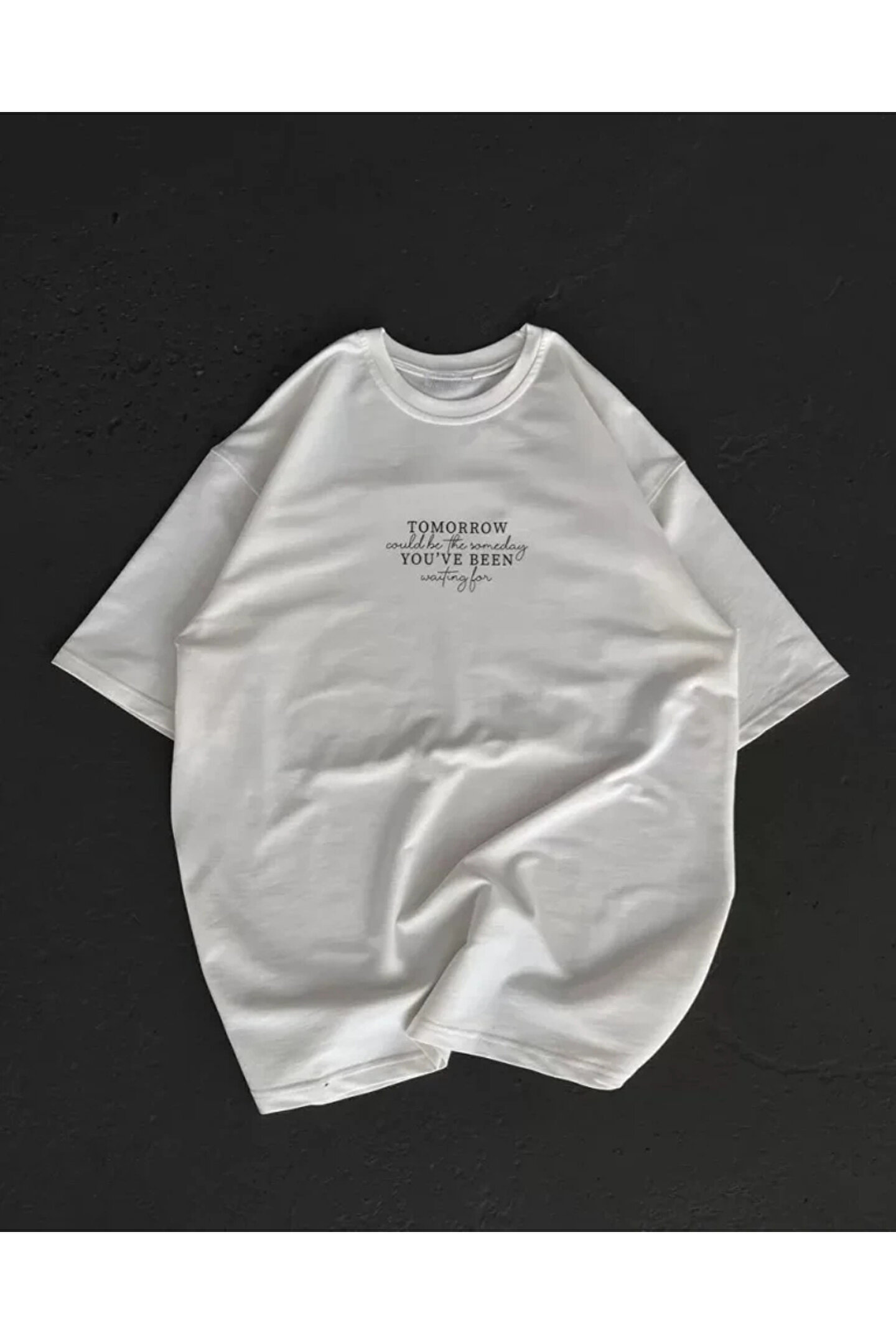 Unisex Bisiklet Yaka Baskılı Oversize T-Shirt - Beyaz