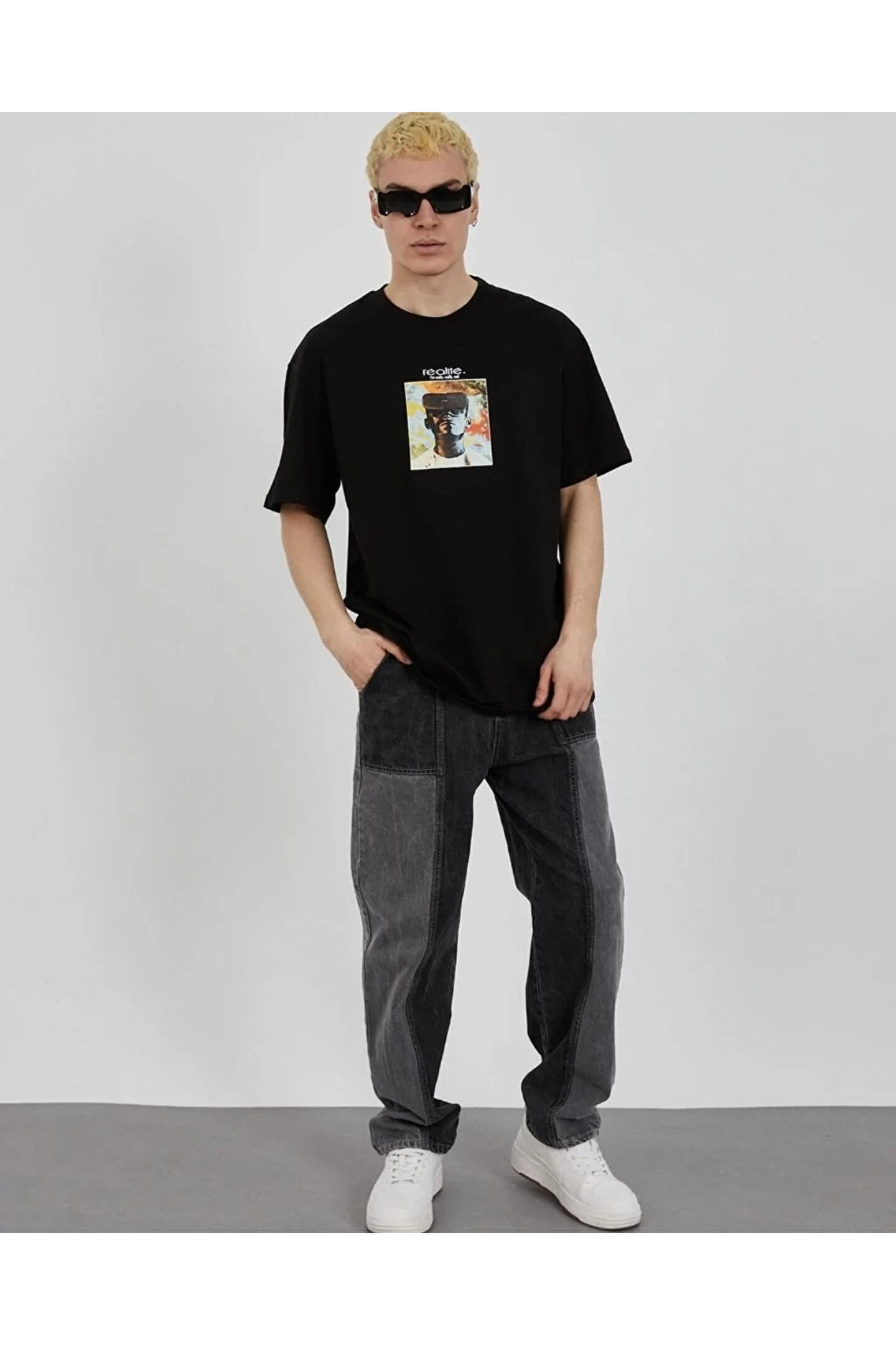 Silerra Unisex Bisiklet Yaka Baskılı Oversize T-Shirt - Siyah
