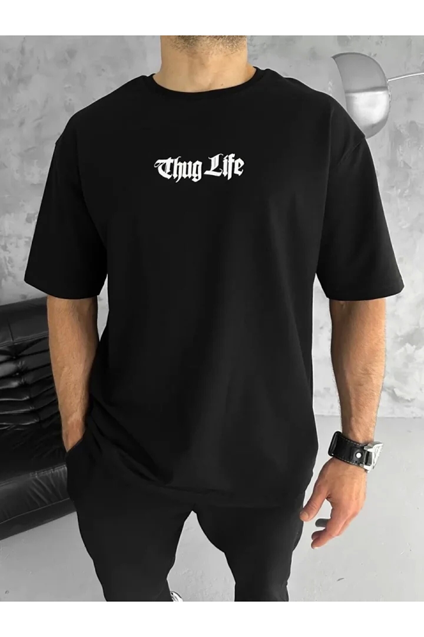 Unisex Bisiklet Yaka Baskılı Oversize T-Shirt - Siyah