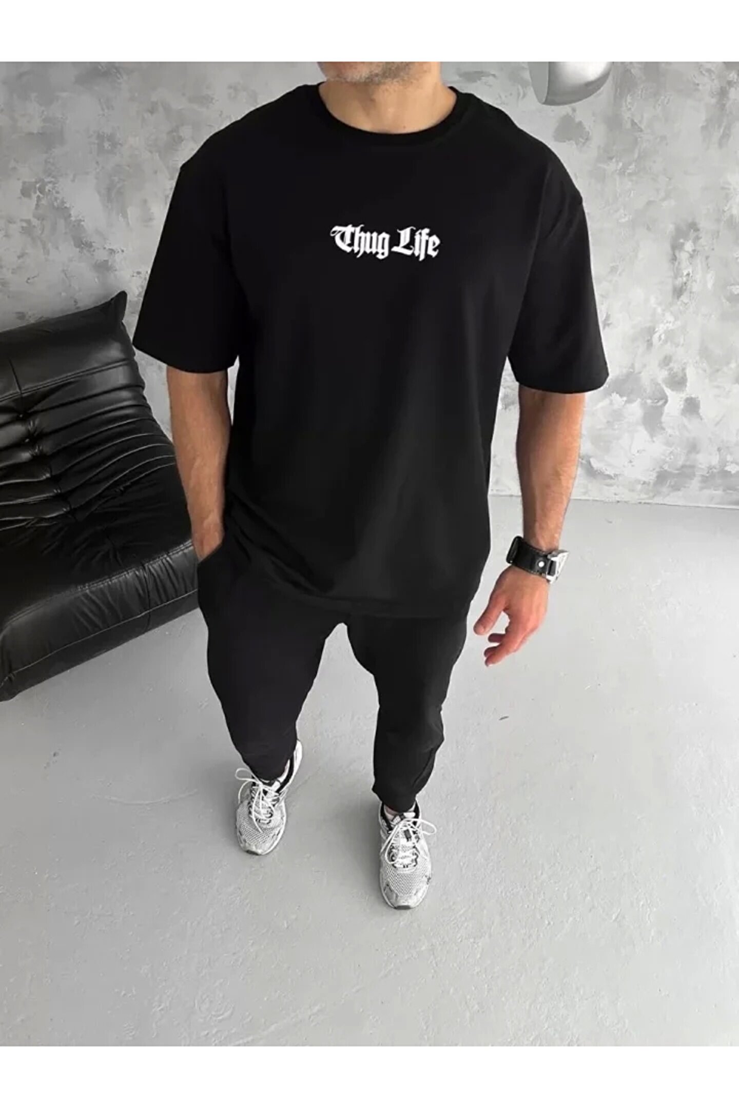 Unisex Bisiklet Yaka Baskılı Oversize T-Shirt - Siyah