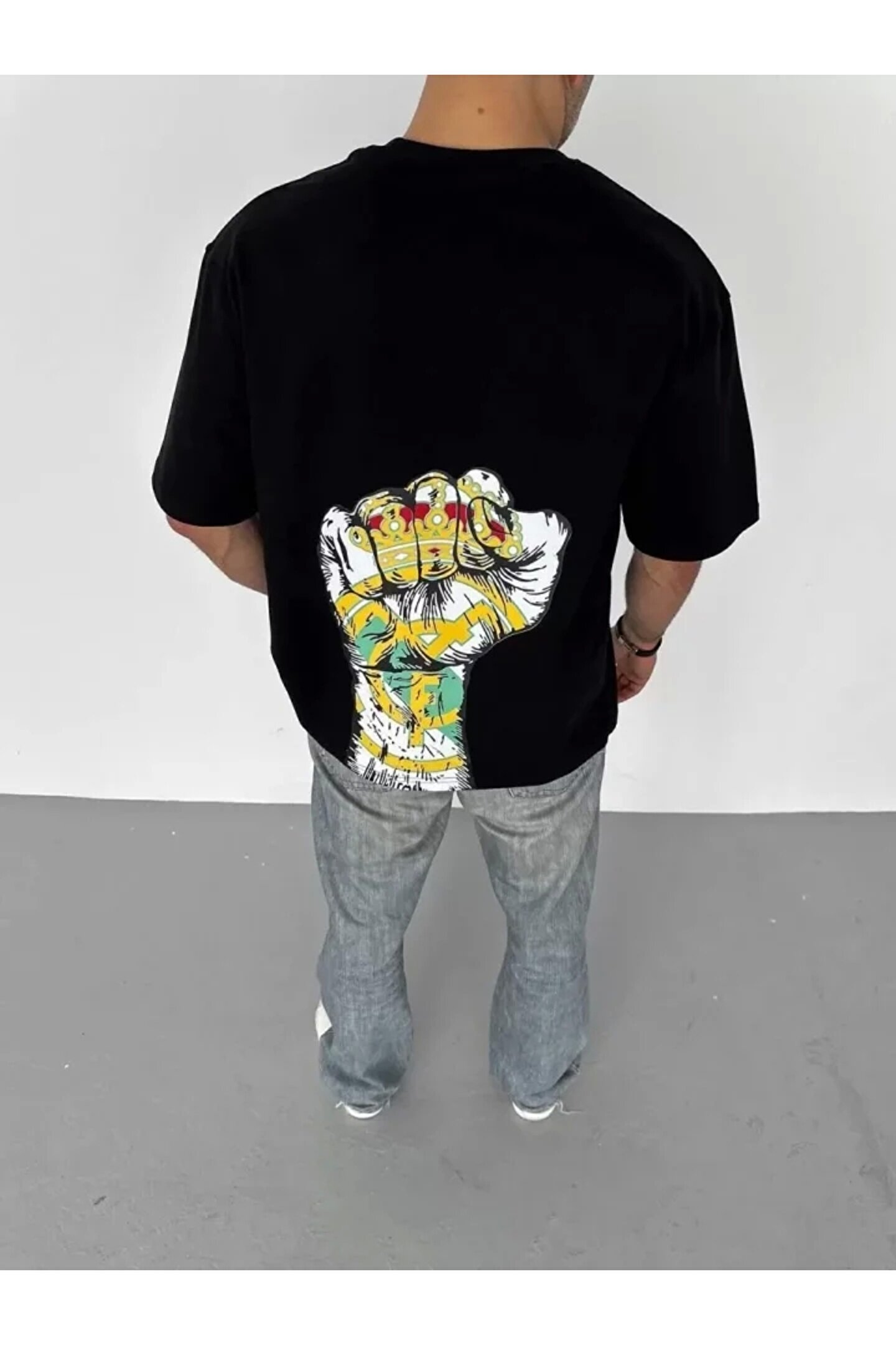 Unisex Bisiklet Yaka Baskılı Oversize T-Shirt - Siyah