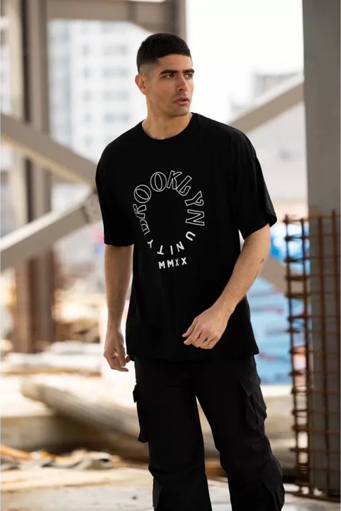 Unisex Bisiklet Yaka Baskılı Oversize T-Shirt - Siyah