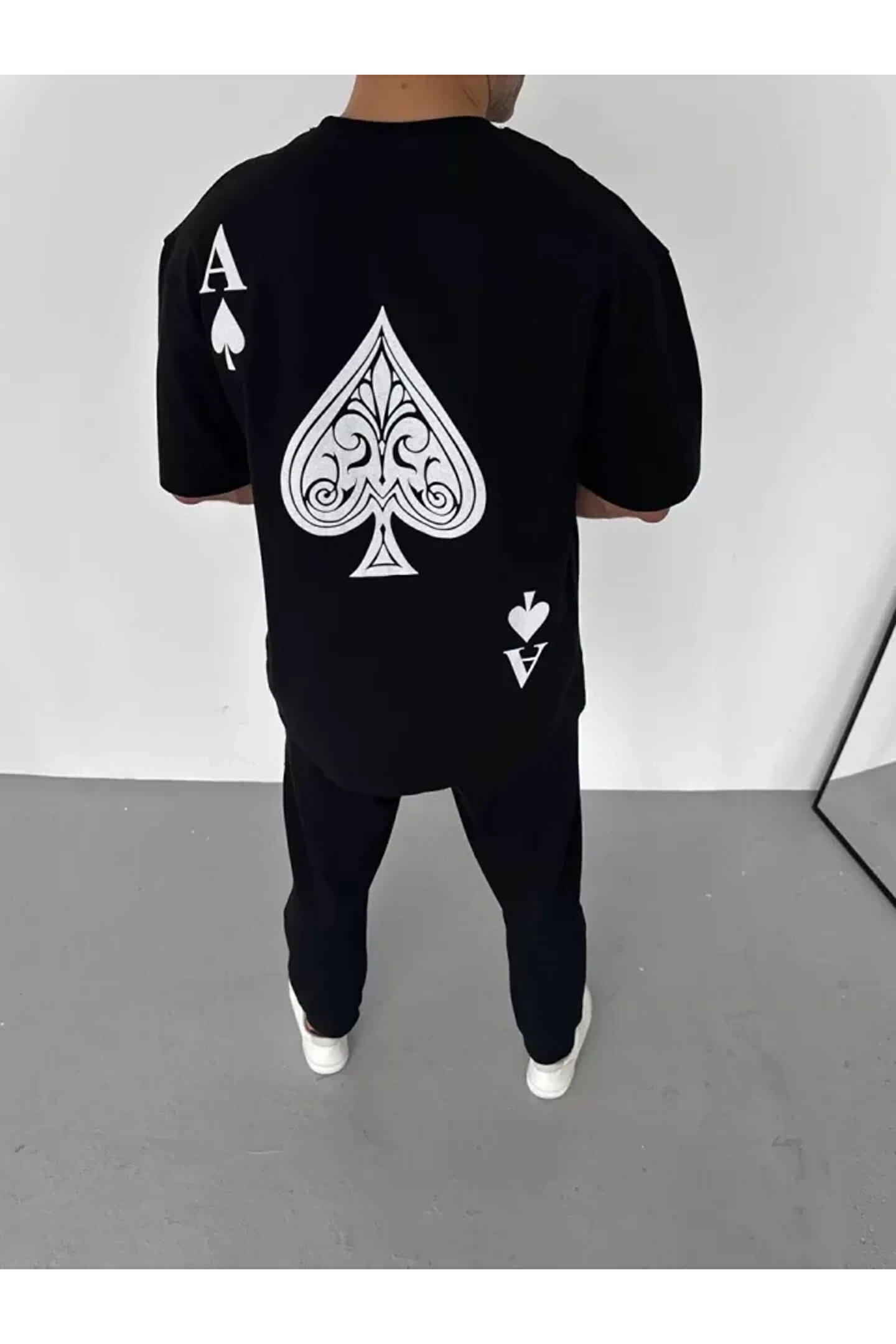 Unisex Bisiklet Yaka Baskılı Oversize T-Shirt - Siyah
