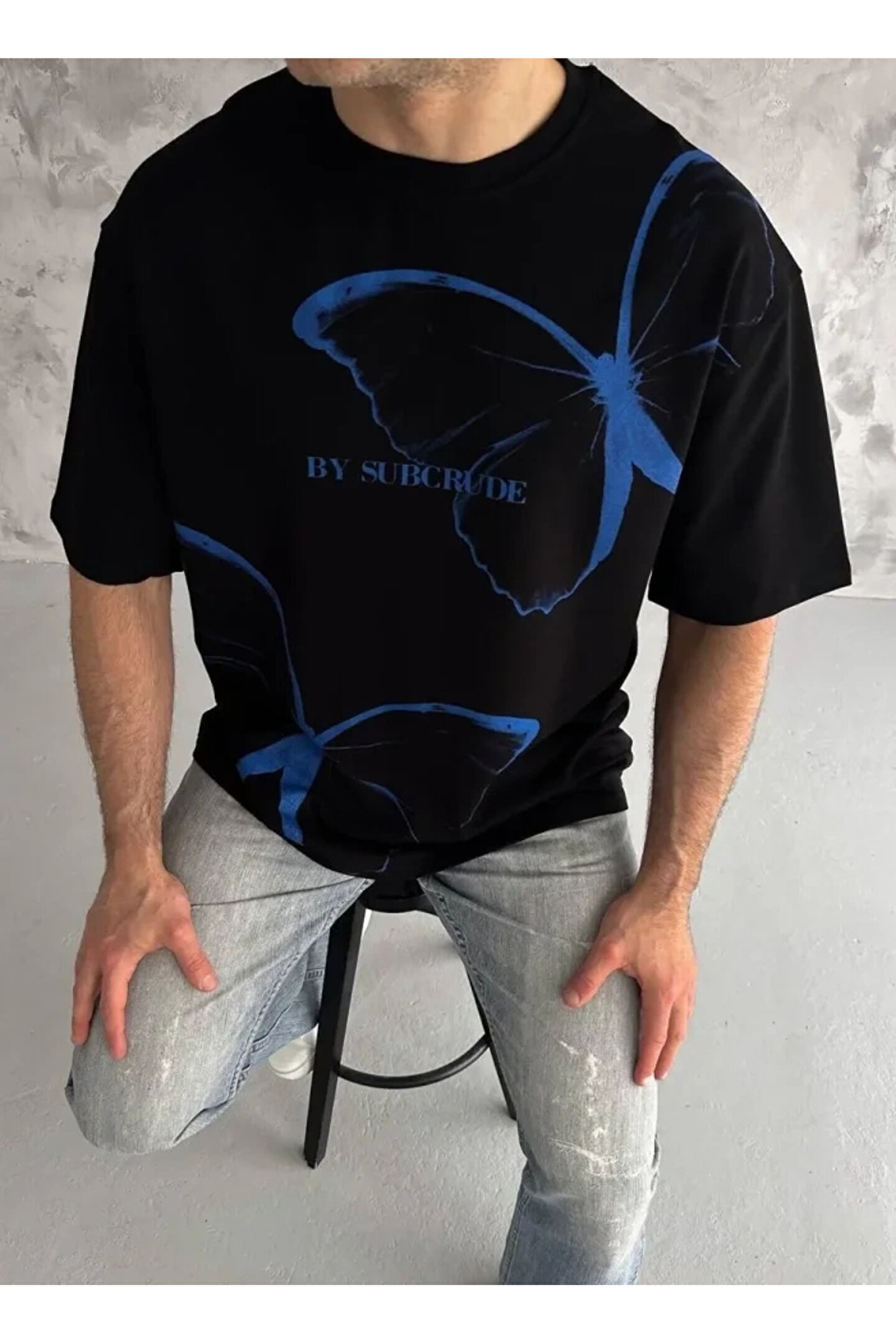 Unisex Bisiklet Yaka Baskılı Oversize T-Shirt - Siyah