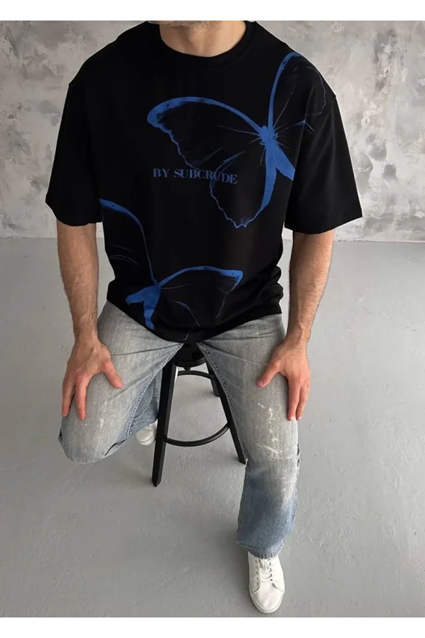 Unisex Bisiklet Yaka Baskılı Oversize T-Shirt - Siyah