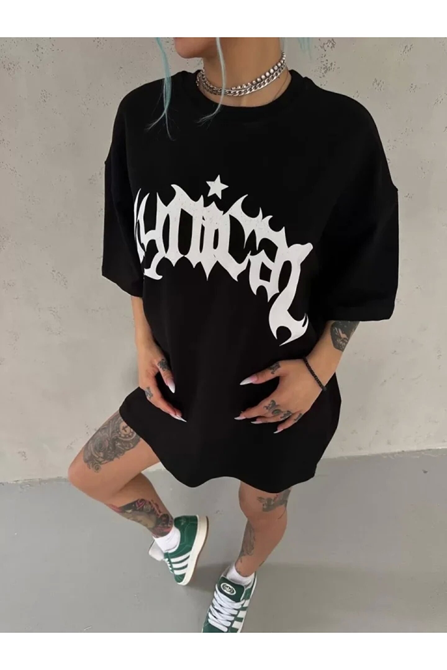 Unisex Bisiklet Yaka Baskılı Oversize T-Shirt - Siyah Modelin Ölçüleri: Boy:165, Kg:55, Göğüs:90, Bel:72, Kalça: 100 Modelin üzerindeki ürün M/38 bedendir