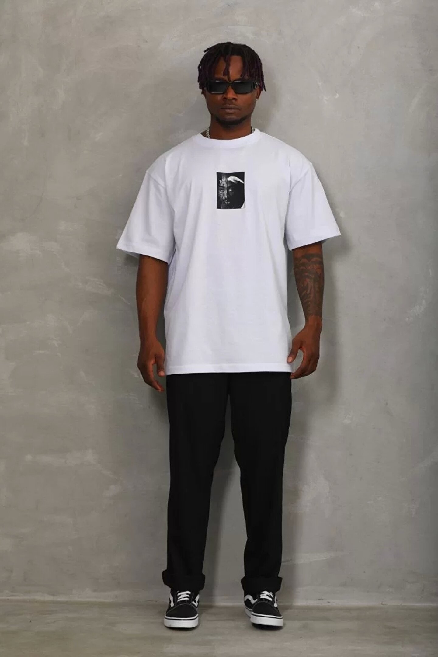 Silerra Unisex Oversize Baskılı Bisiklet Yaka T-Shirt - Beyaz