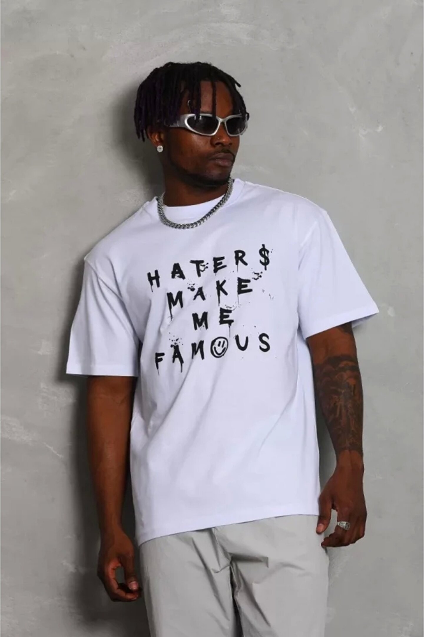 Unisex Oversize Baskılı Bisiklet Yaka T-Shirt - Beyaz