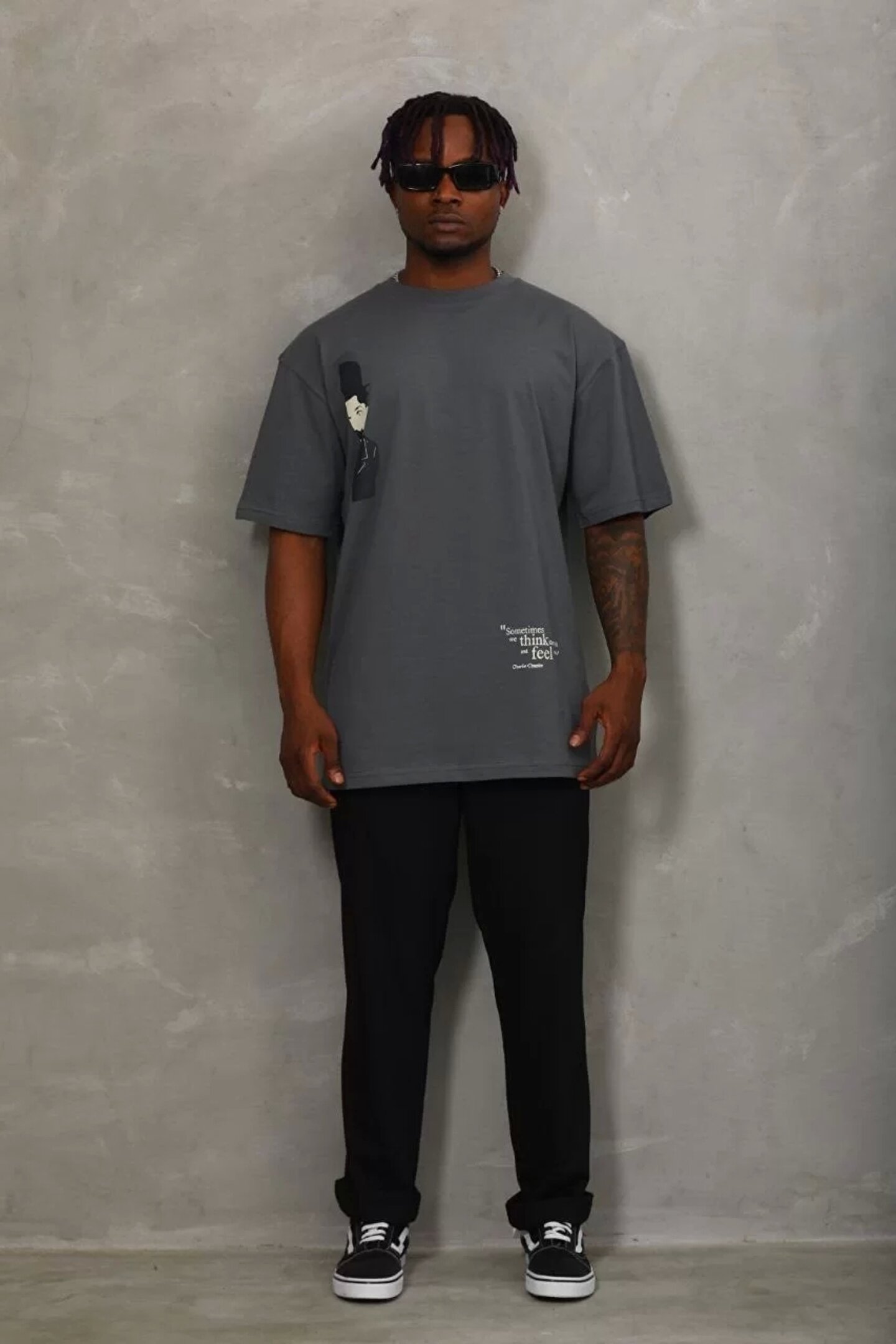 Silerra Unisex Oversize Baskılı Bisiklet Yaka T-Shirt - Füme