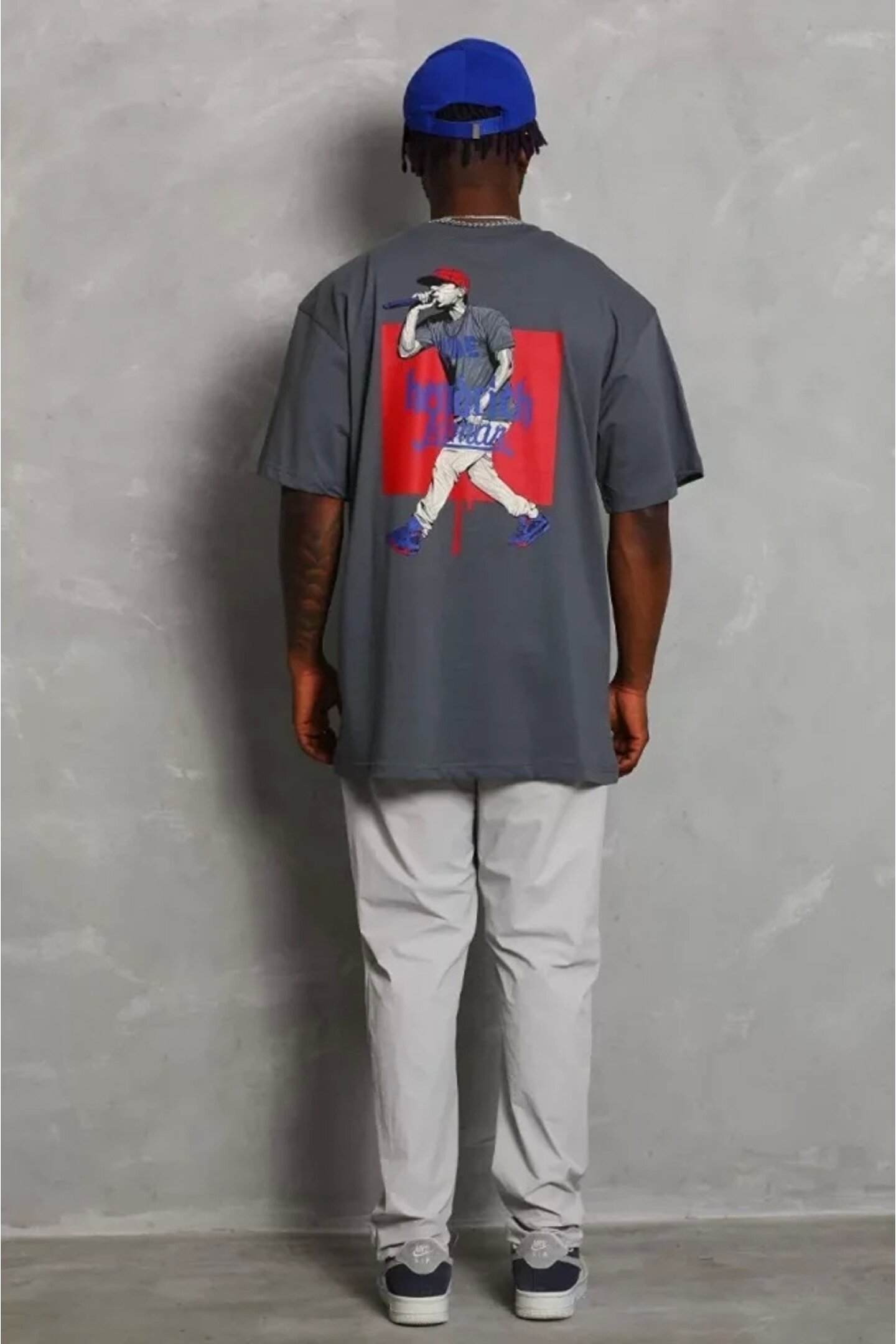 Unisex Oversize Baskılı Bisiklet Yaka T-Shirt - Füme