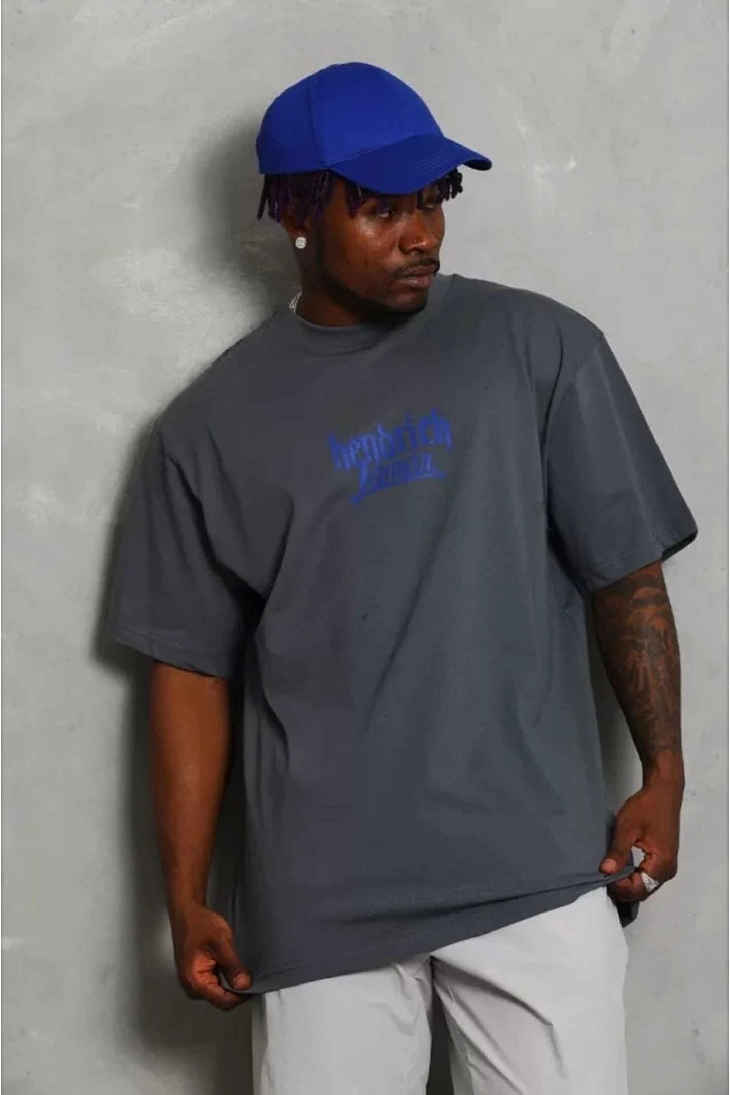 Unisex Oversize Baskılı Bisiklet Yaka T-Shirt - Füme