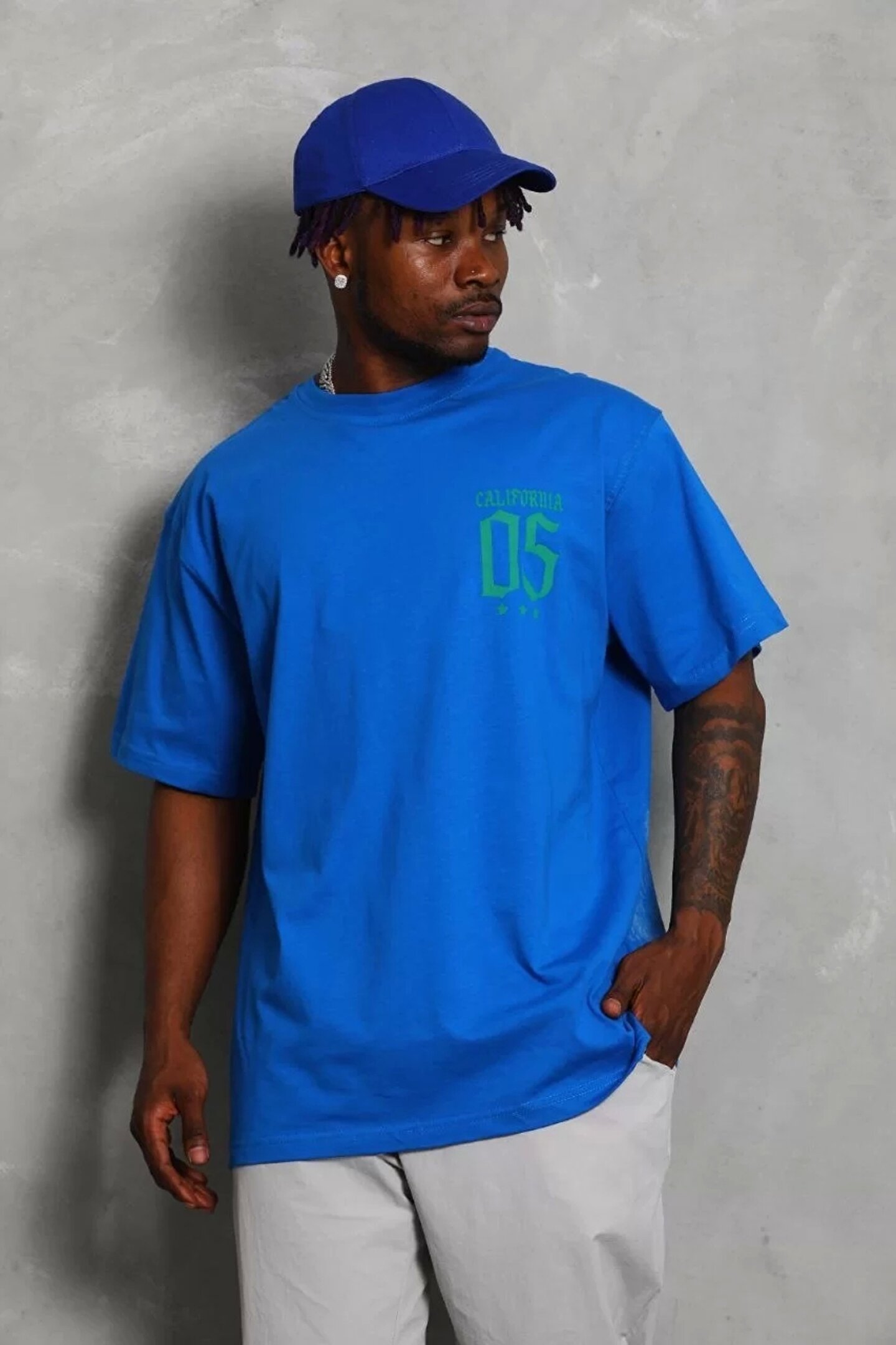 Unisex Oversize Baskılı Bisiklet Yaka T-Shirt - Mavi