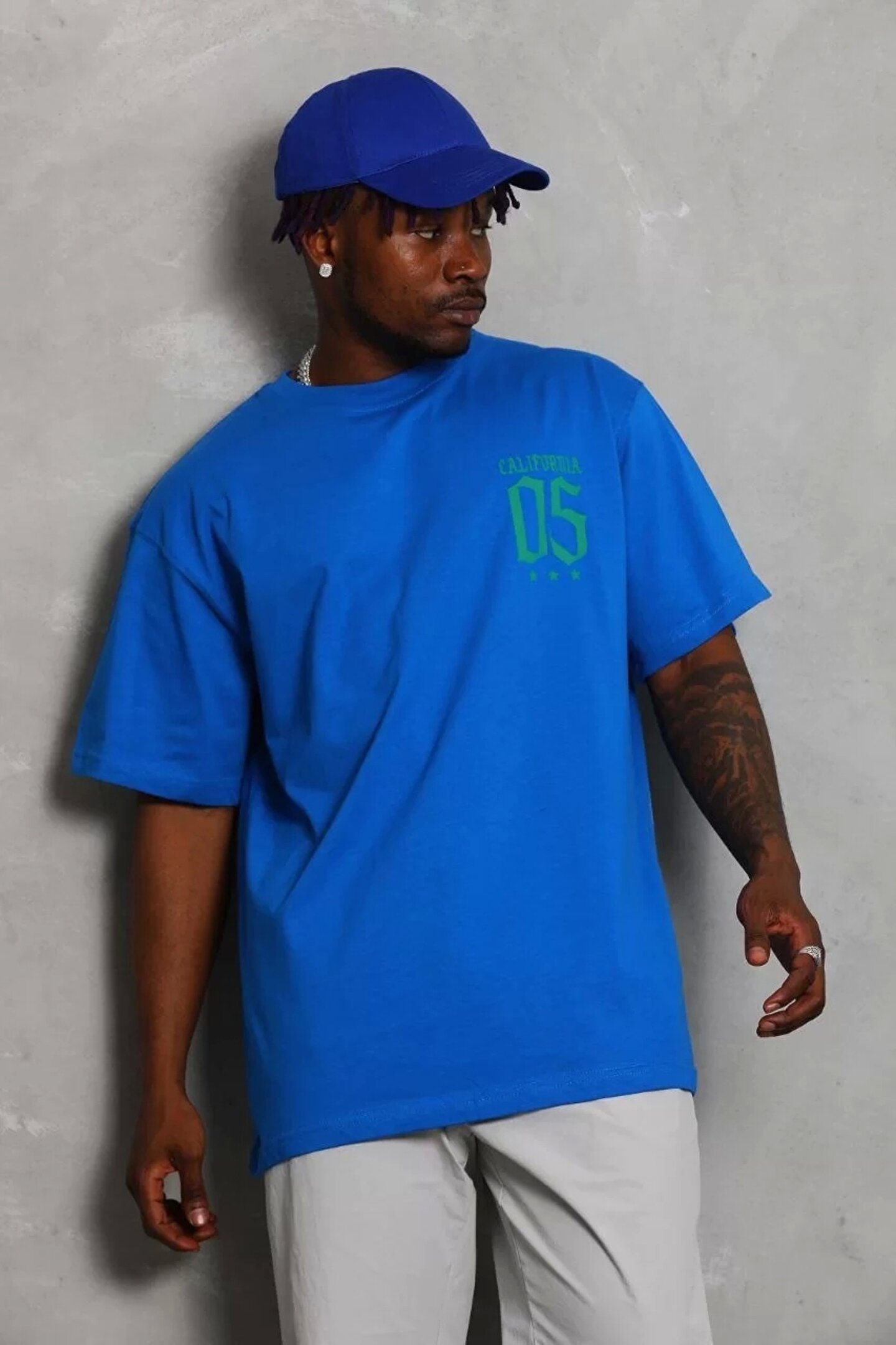 Unisex Oversize Baskılı Bisiklet Yaka T-Shirt - Mavi