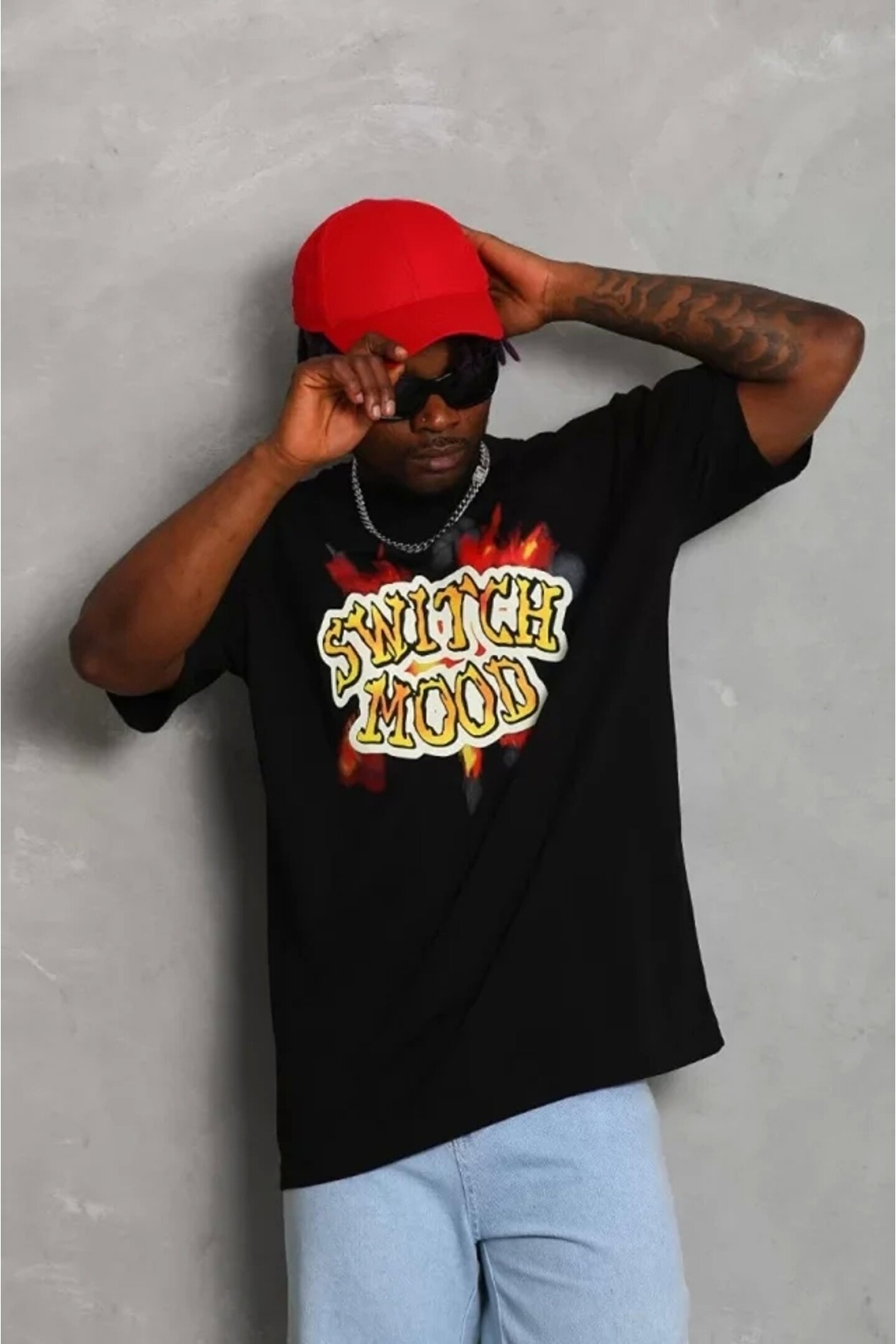 Unisex Oversize Baskılı Bisiklet Yaka T-Shirt - Siyah
