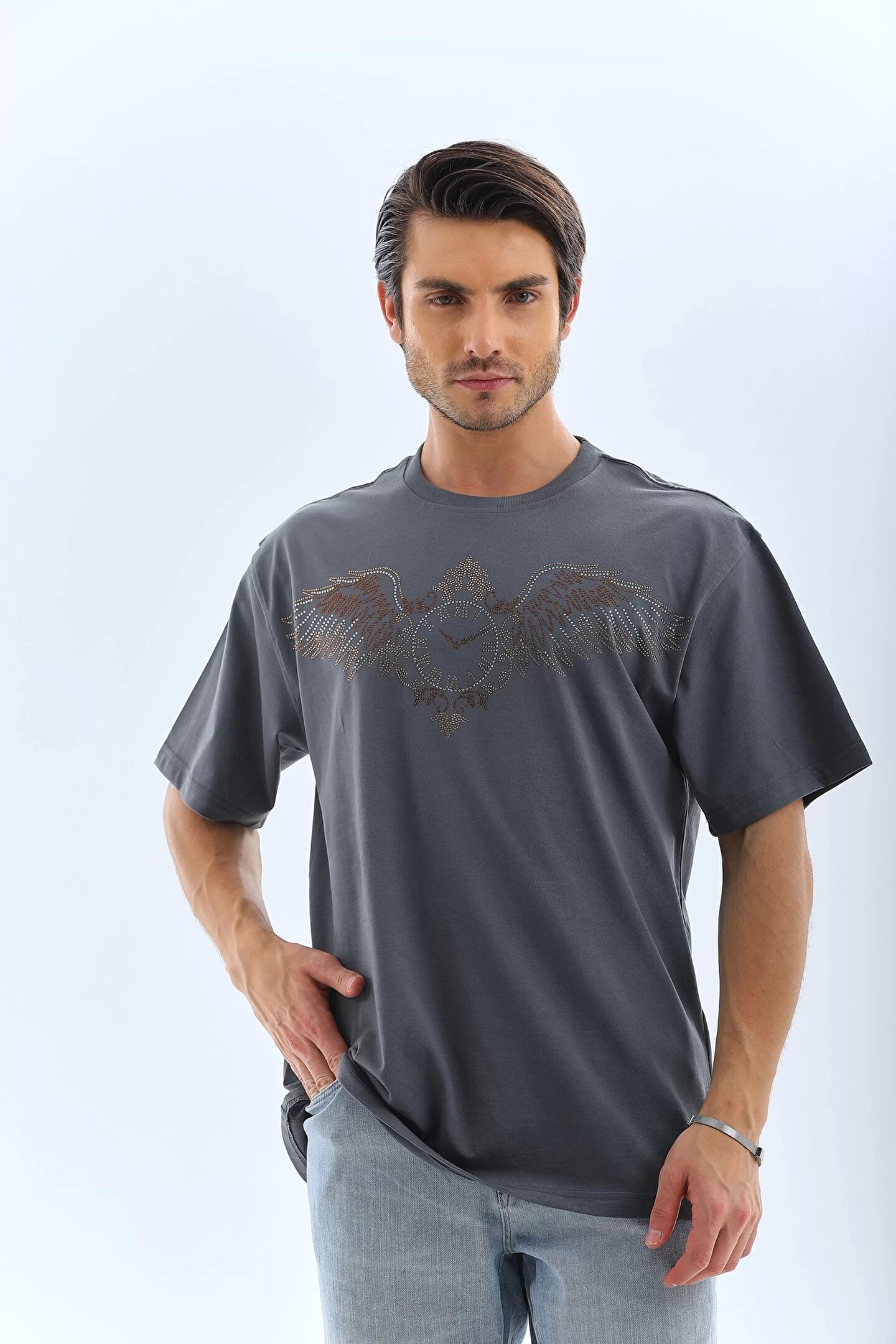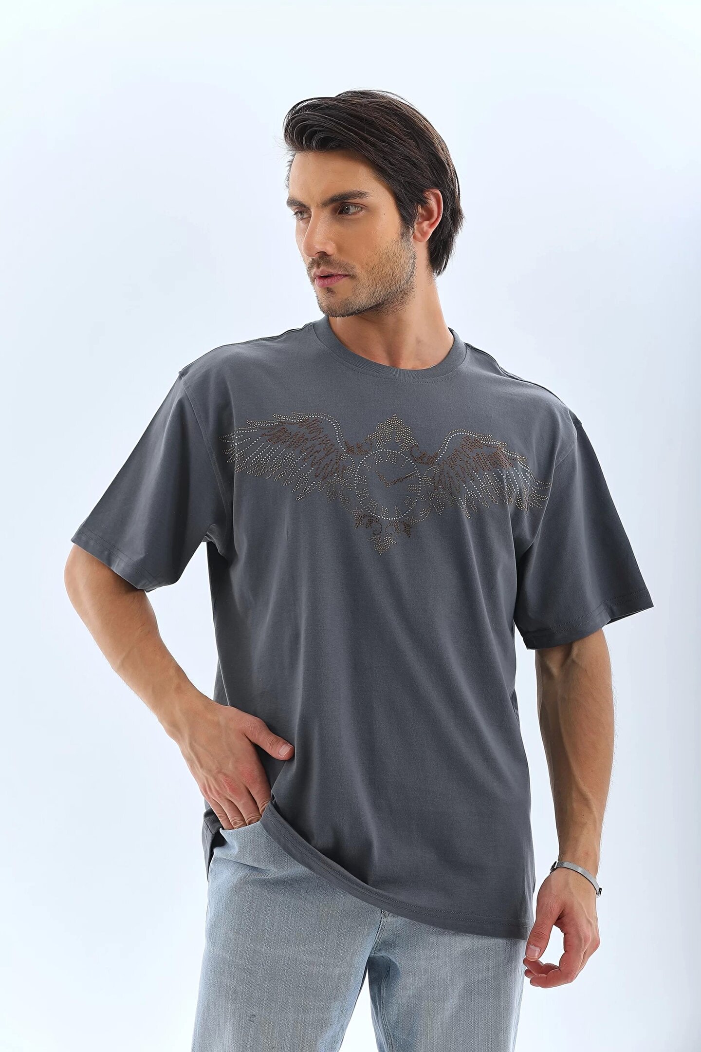 Unisex Oversize Taşlı Bisiklet Yaka T-Shirt - Füme