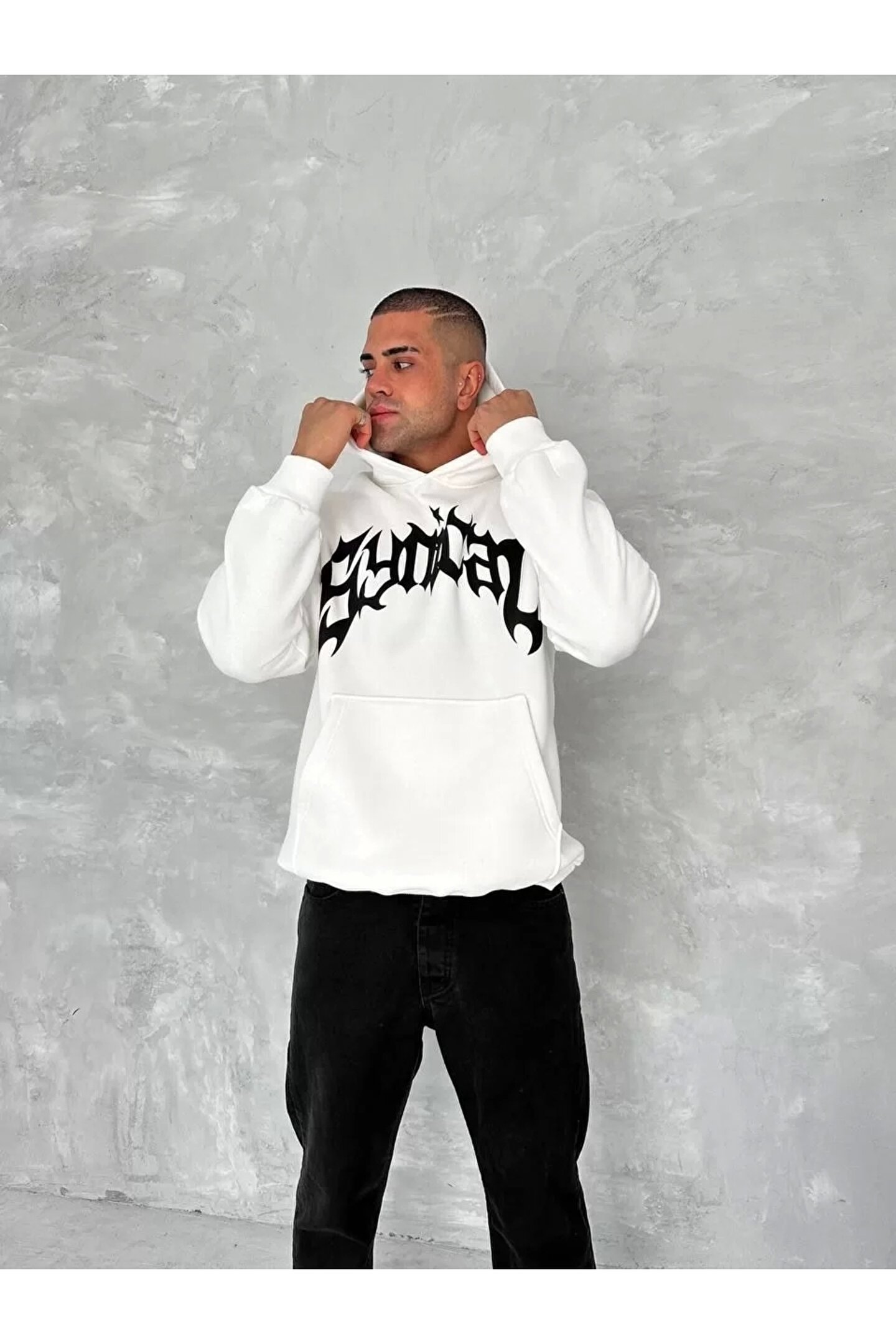 Silerra Unisex Üç İplik Kapüşonlu Baskılı SweatShirt - Beyaz