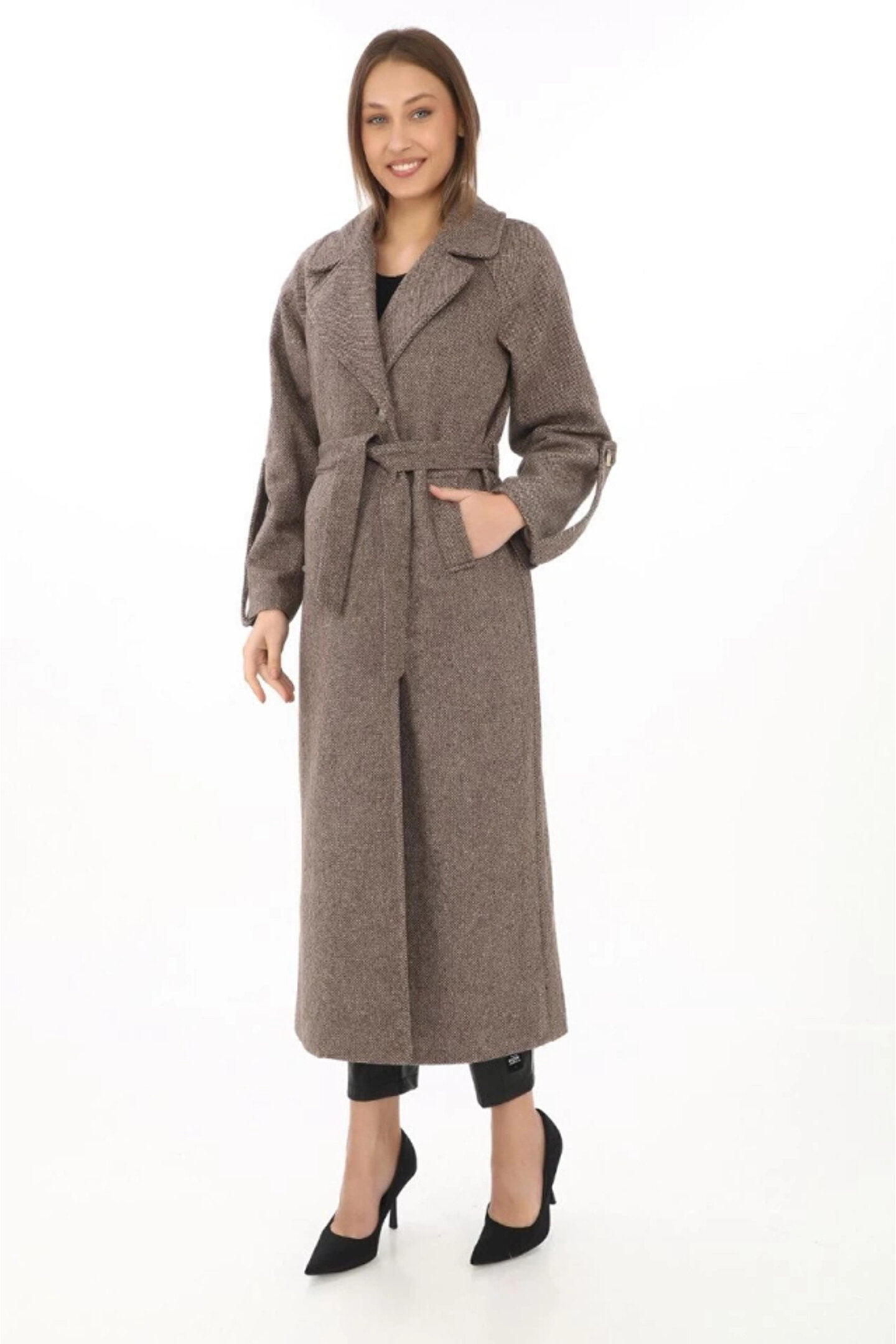 Uzun Kaşe Kaban – Yünlü Dokuma Kaşmir Kumaş, Kruvaze Yaka, Kuşaklı Astarlı Tesettür Uyumlu Şık Kışlık Siyah Model- Vizon