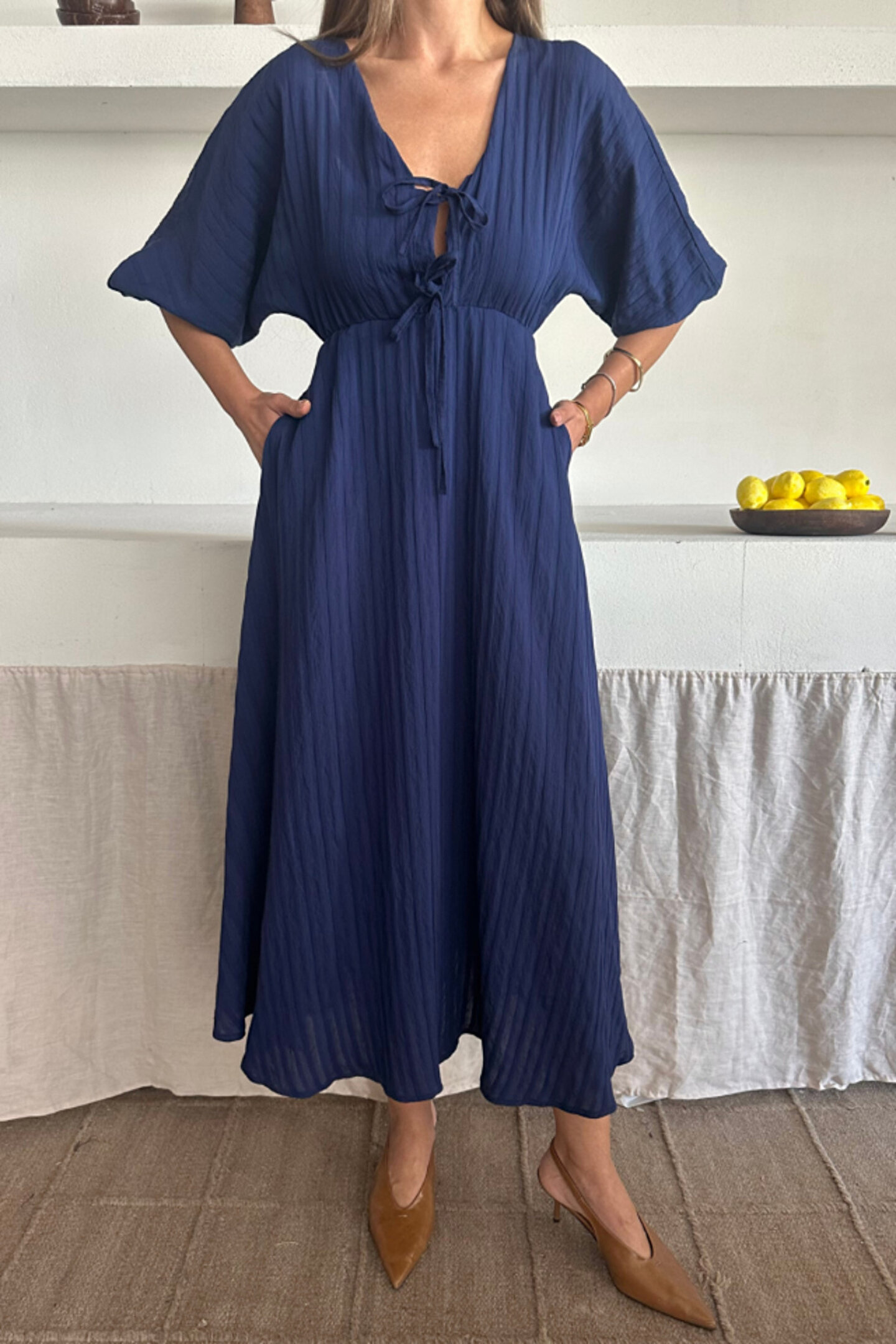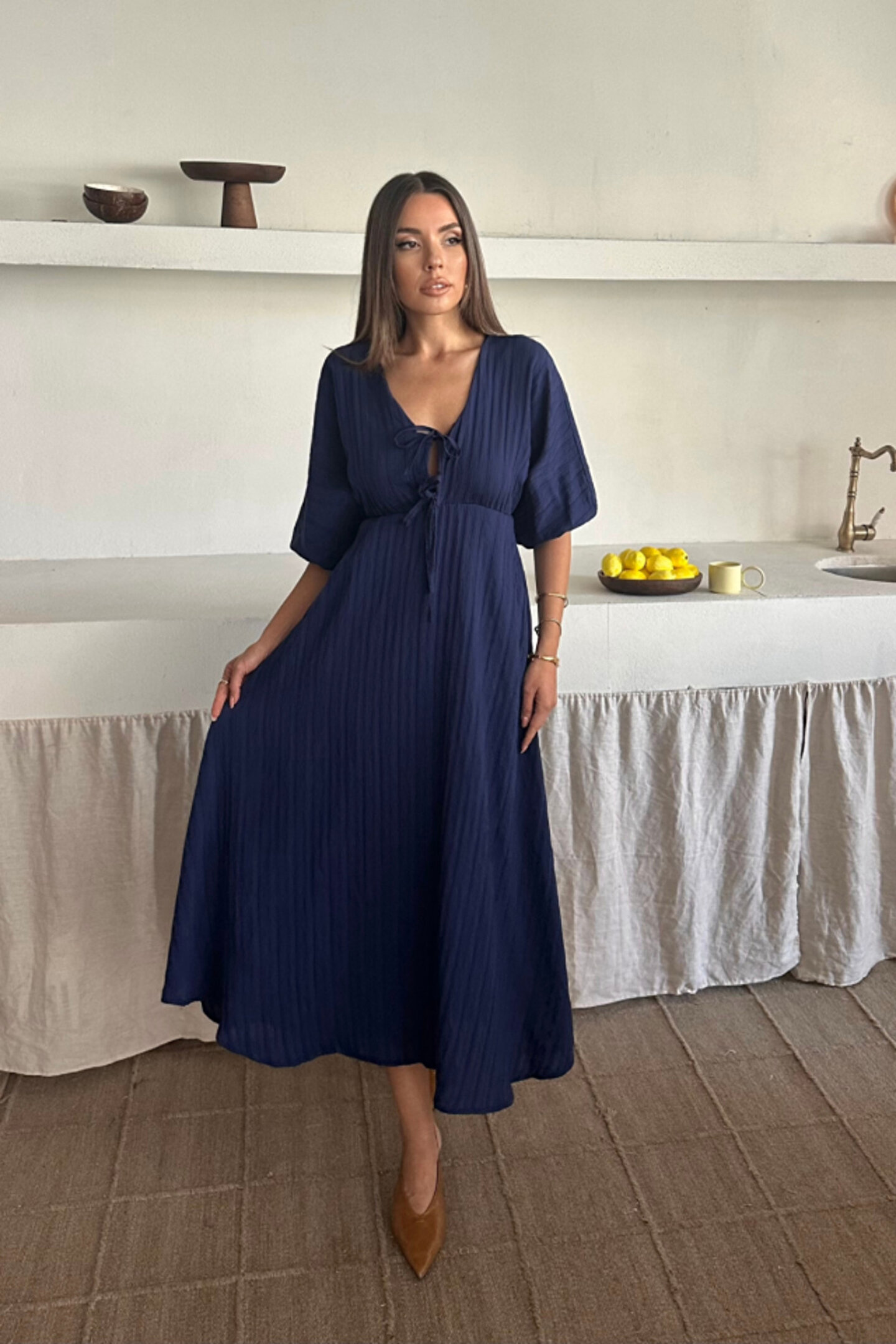 V YAKA DÖKÜMLÜ ELBİSE - Lacivert