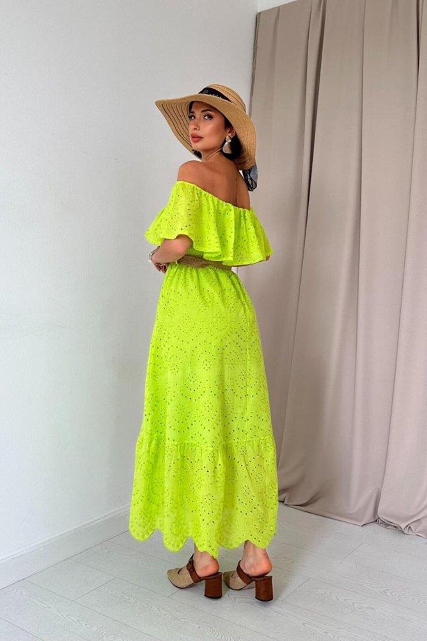 Yağ Yeşili Omzu Lastikli Brode Elbise