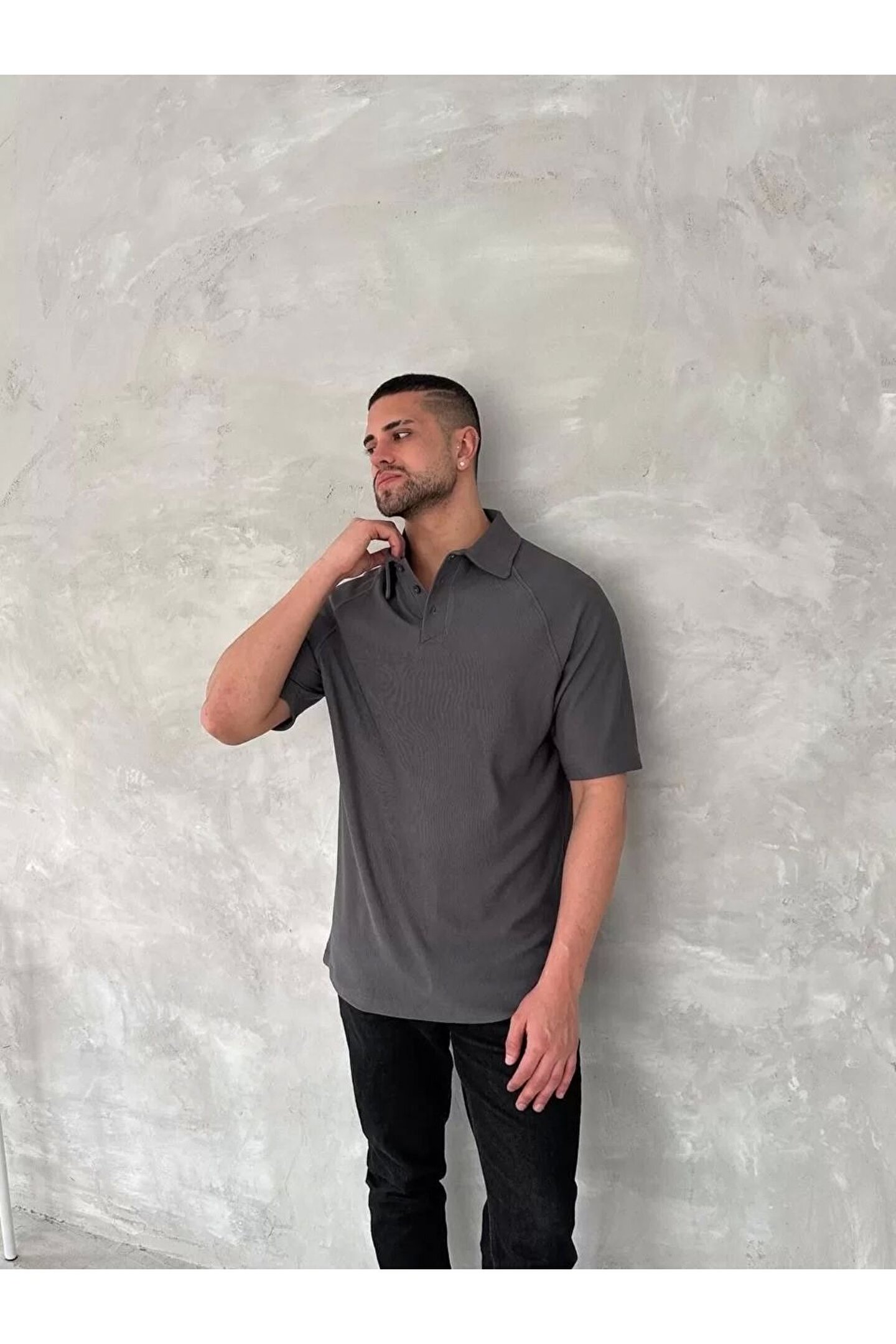 Yakalı Patlı Kısa Kol T-shirt - Antrasit