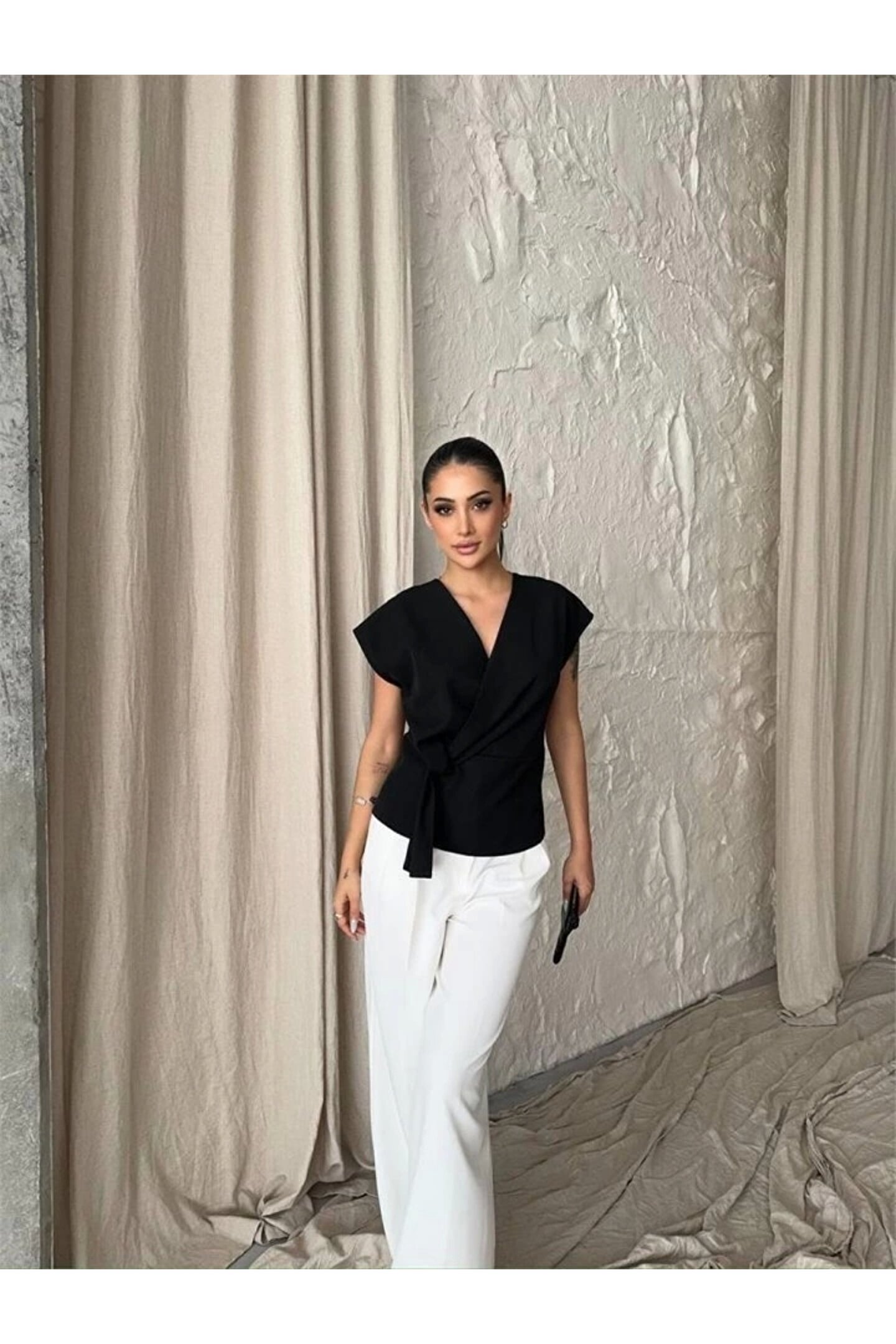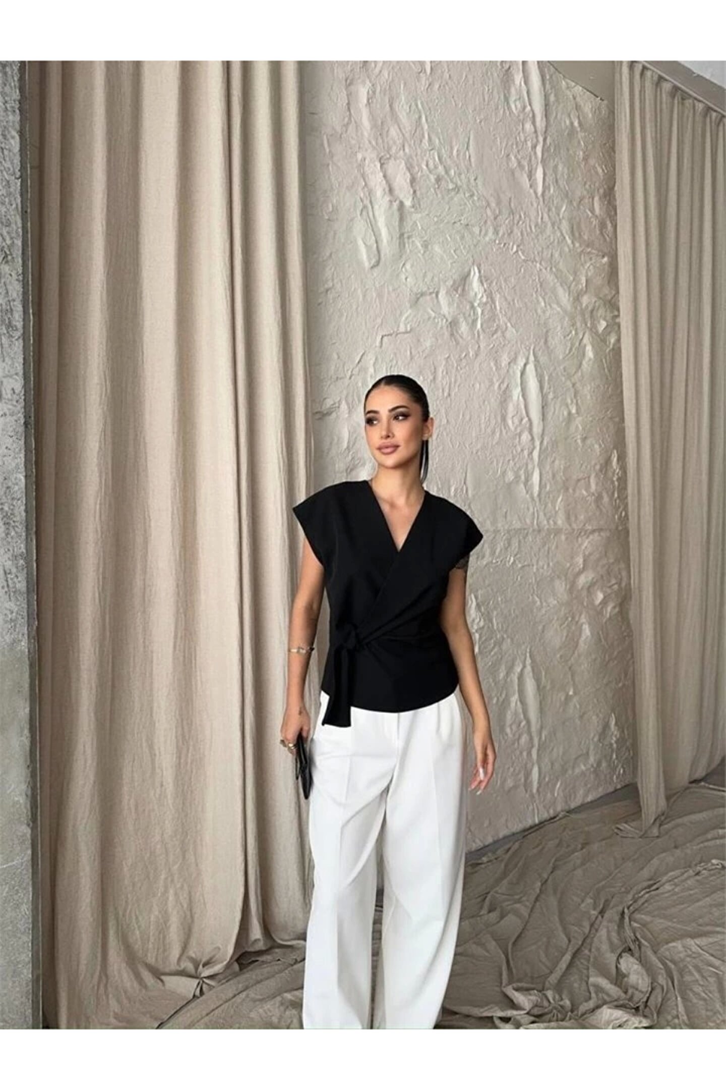 YANDAN BAĞLAMA DETAYLI KOLSUZ BLUZ - Siyah
