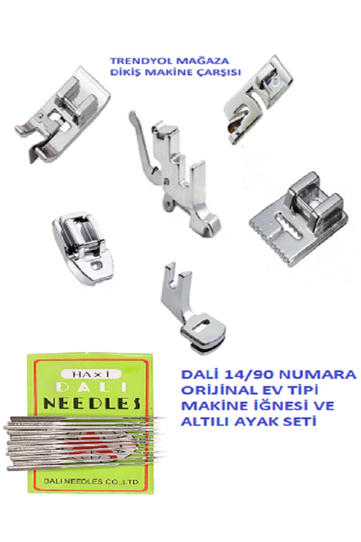 DİKİŞ MAKİNE AYAK SETİ (KIVIRMA-BÜZGÜ-NERVÜR-SÜRFİLE - GİZLİ FERMUAR AYAK VE TAŞIYICI YANİ AYAK TUTUCU BERABER) ALTILI AYAK SETİ DALİ ORİJİNAL İĞNE 10 ADET TÜM ZİGZAG DİKİŞ MAKİLERİ İLE UYUMLUDUR. ; SİNGER BEKO ZETİNA BERNİNA HOMEMAX BROTHER SİNBO DİAMOND BİNDALLI GİBİ TÜZ MAKİNELERDE UYUM GÖSTERİR AYAK TOPLAM SET HALİNDE 6 ÇEŞİT PARÇA İLE GELECEKTİR. ; ORİJİNAL DİKİŞ MAKİNE ÇARŞISI ÜRÜNÜ OLUP SAHTE ÜRÜNLERDEN SAKININIZ. ; ÜRÜNÜMÜZ İÇİNDEN DALİ 14 NUMARA 10 ADET İĞNE MUTLAKA ÇIKACAKTIR EĞER ÇIKMAZ İSE EKSİK ÜRÜN BİLDİRGESİ OLUŞTURUN...;