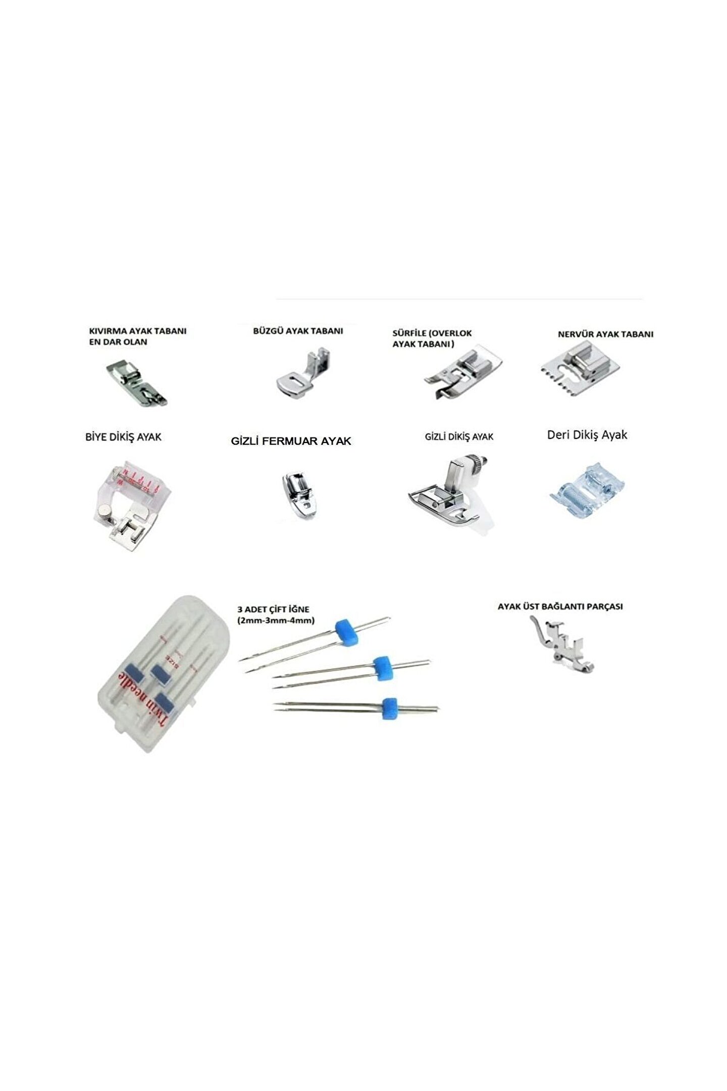 Singer bekozetina Berna bindallı Janome homemax gibi tüm dikiş makineleri için Ayaklar en çok kullanılan dikiş ayaklarıdır çift iğnemiz 2 milim 3 milim 4 milim olmak üzere paketin içinde çıkmaktadır görselde görmüş olduğunuz tüm ayaklar paket içerisinde çıkacaktır toplam 8 ayak ve ayak tutucu ile çift iğne seti 10 parçadır