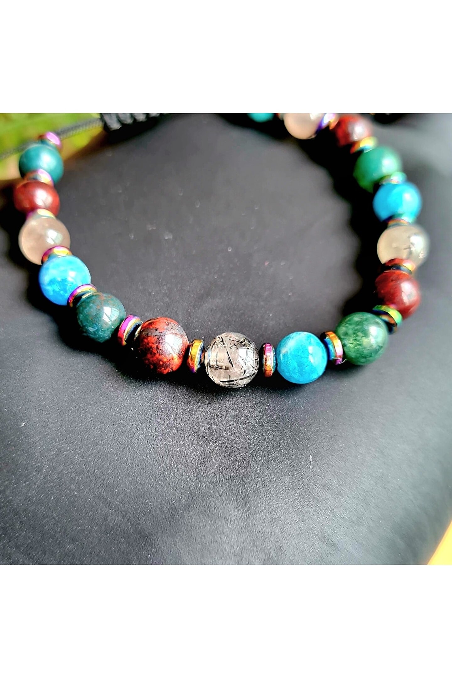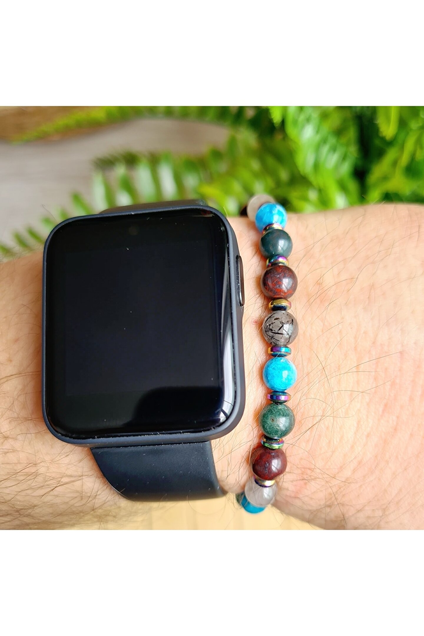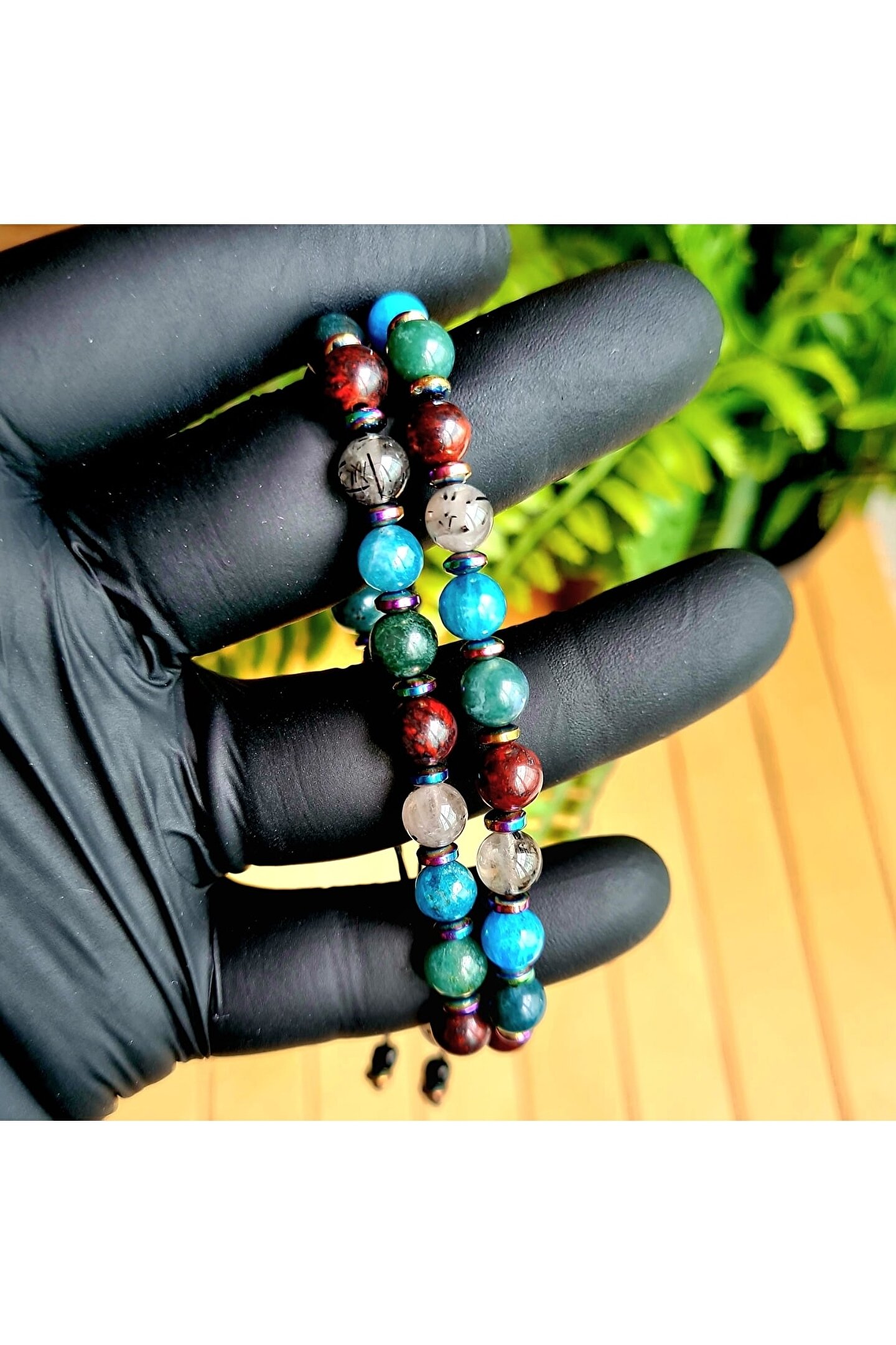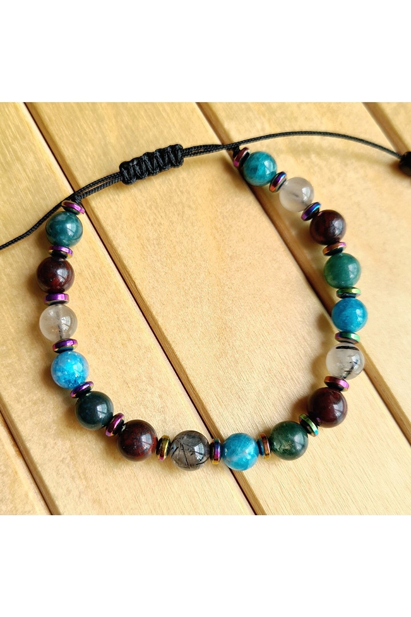 İkizler burcu için özel olarak tasarlanmış, doğanın saf güzelliğini yansıtan bir bileklik; Apatit, rutil kuvars, yosun akik ve kan taşı gibi doğal taşların eşsiz kombinasyonu ile hem şıklığı hem de enerjiyi bir arada sunar; Doğal taş materyali sayesinde her bileklik benzersizdir ve her kullanımda farklı bir deneyim sağlar; İkizler burcu bireylerinin enerjilerini dengelemelerine yardımcı olacak bu bileklik, kişisel stilinizi tamamlamanız için ideal bir aksesuardır;