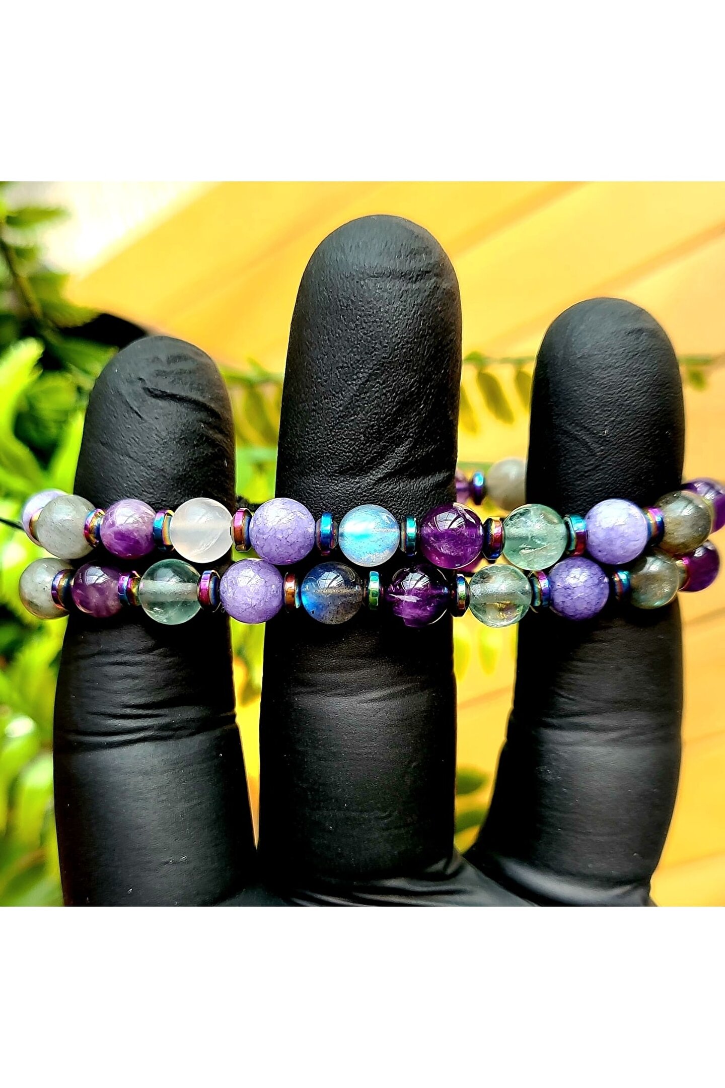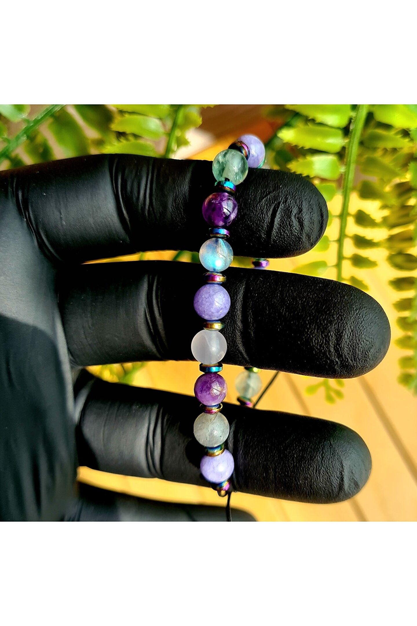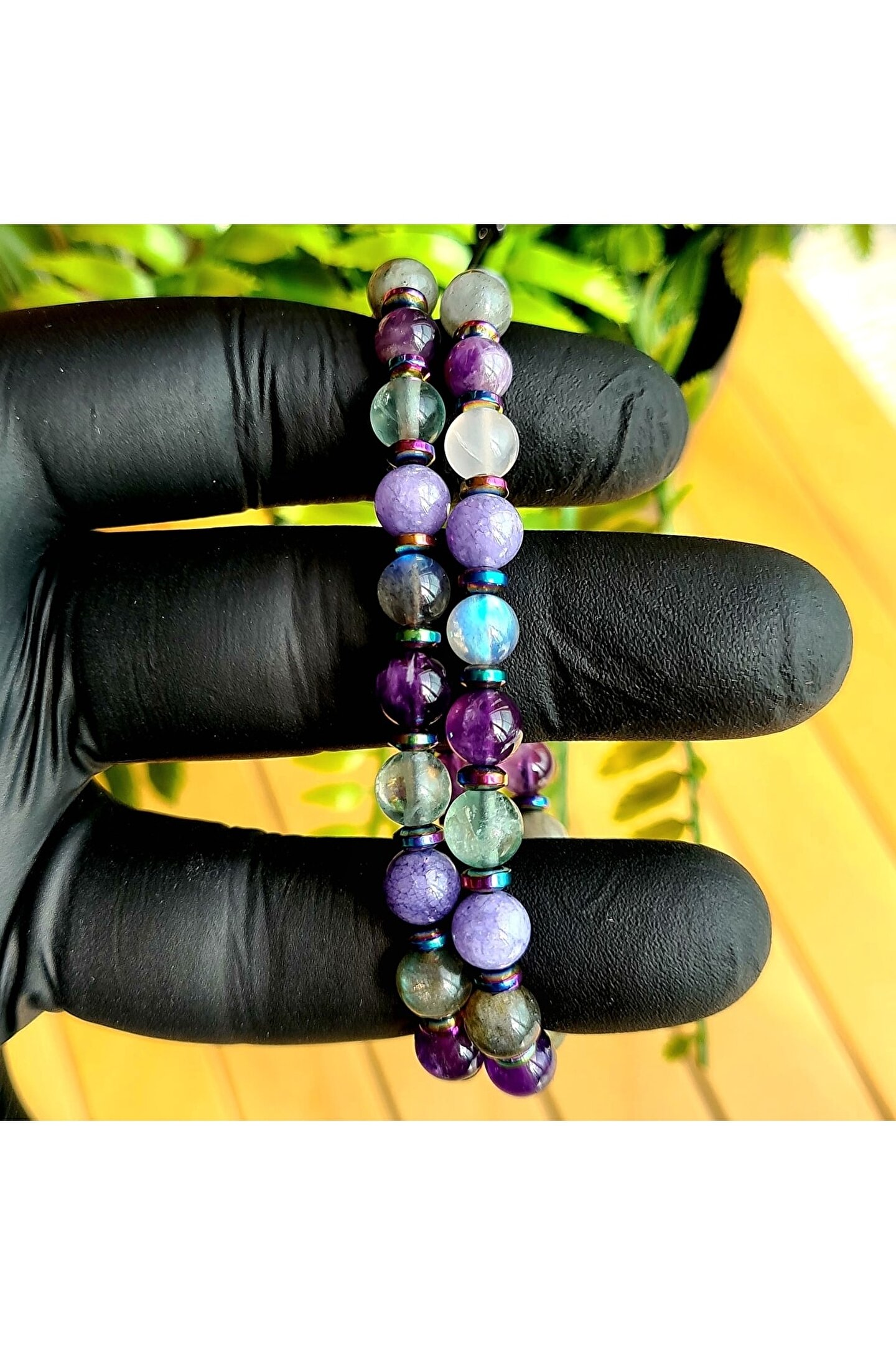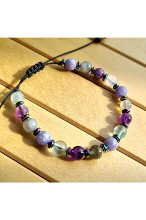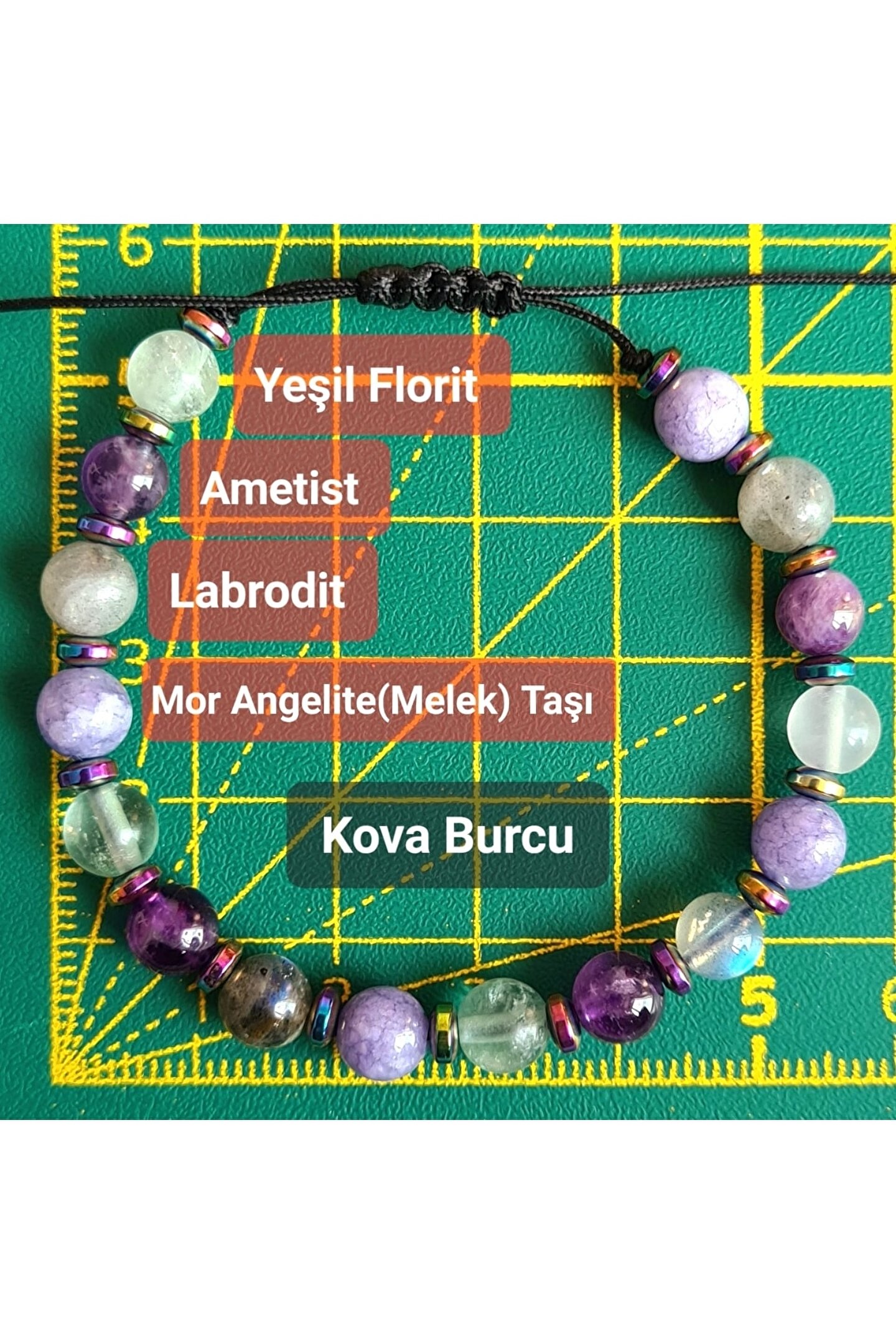 El yapımı tasarımıyla öne çıkan bu bileklik, her bir parçasında özenle seçilmiş doğal taşlar kullanılarak üretilmiştir; Florit, ametist, labradorit ve angelite gibi nadir bulunan ve şık bir görünüm sunan taşlarla tasarlanmıştır; Doğal taş materyali sayesinde her bileklik benzersiz ve eşsiz bir dokunuşla öne çıkar; Kova burcu bireyleri için özel olarak tasarlanmış bu bileklik, kişisel tarzınıza zarif bir dokunuş ekler;