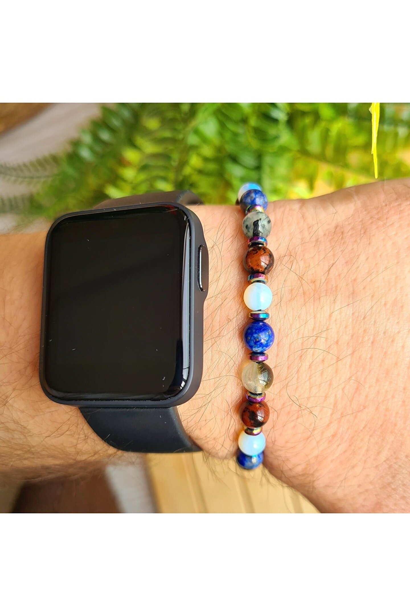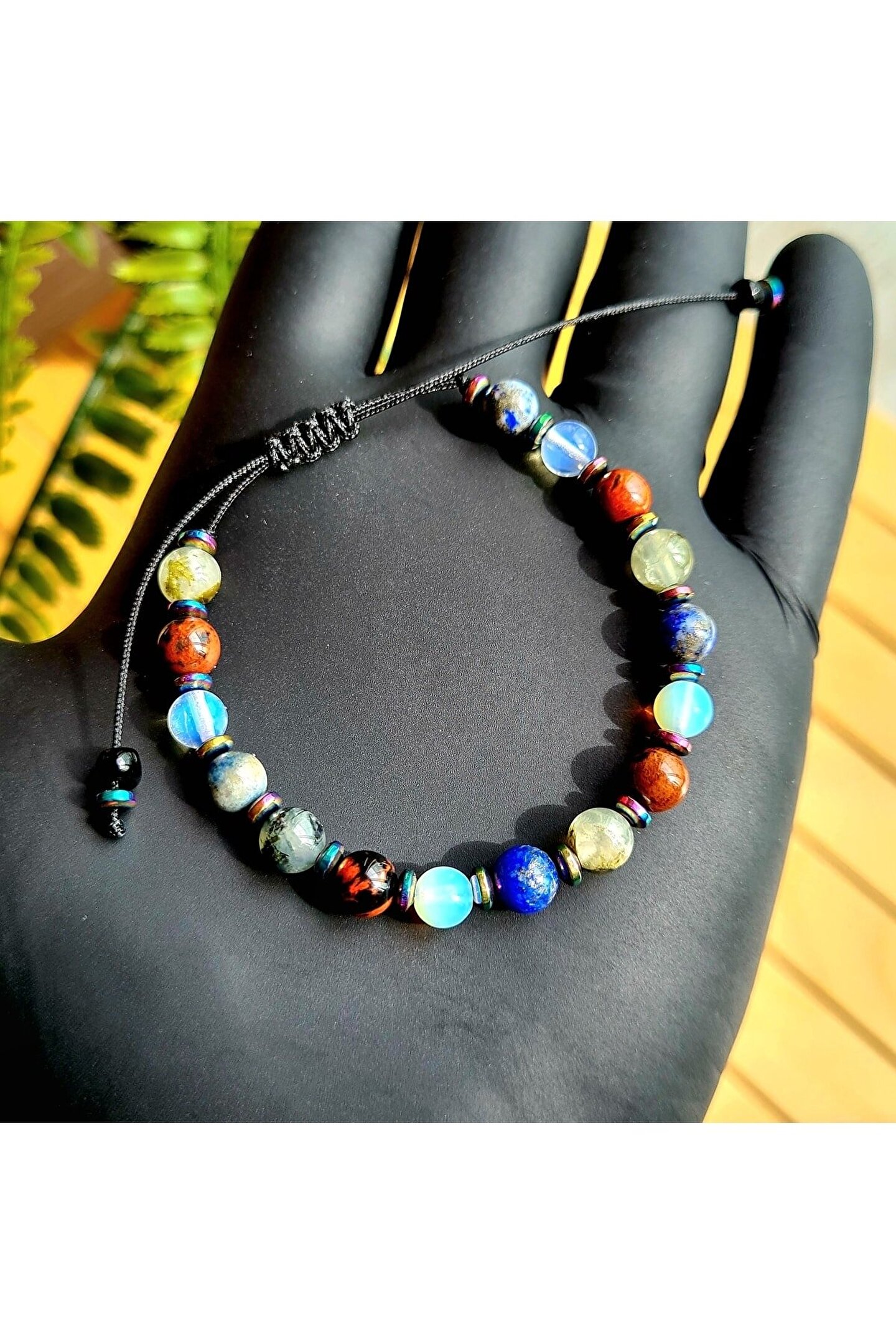 Doğal taş bileklik, benzersiz ve otantik bir aksesuar deneyimi sunar; Lapis lazuli, beyaz opal, maun obsidyen ve prehnit gibi farklı doğal taş türleriyle zenginleştirilmiş tasarım, her bir bileklikte farklı bir karakter kazandırır; Doğal taş kullanımı sayesinde her bileklik, doğanın saf güzelliğini ve enerjisini parmaklarınıza taşır; Bu bileklikler, hem günlük kullanım hem de özel günler için ideal bir aksesuar seçeneği olarak öne çıkar;