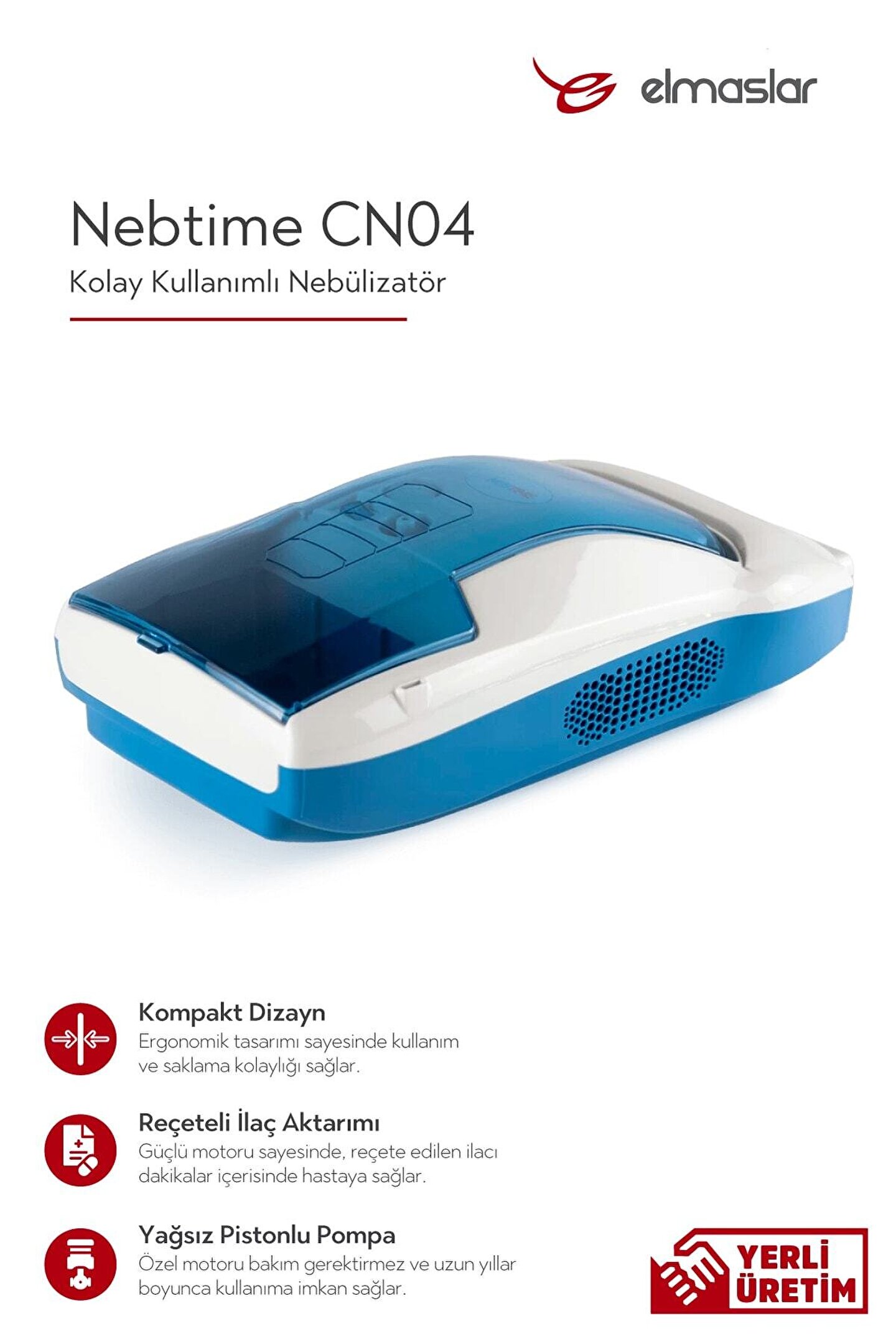 Bu kompakt cihaz, doktor tavsiyesi ile verilen ilacı verimli bir şekilde hastaya vermek için dizayn edilmiştir. ; Doğru kullanım ve bakım ile uzun yıllar size guvenilir bir tedavi sağlayacaktır. ; Ürunumuz astım, alerjiler ve diğer solunum yolu ile ilgili duzensizliklerin başarılı tedavisi için geliştirilmiştir. ; Oluşturduğu hava akımı temiz borudan geçerek ilaç kabına girer. ; Ilaç kabına giren hava, doktor onaylı ilacın, aerosol buhara çevrilerek, hasta tarafından kolay solunumunu sağlar;