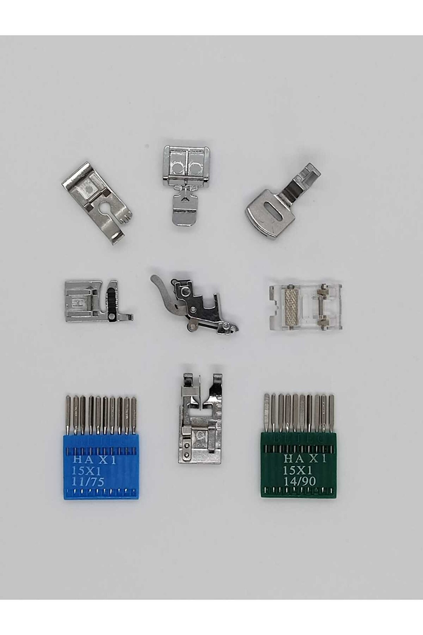 Ev tipi Dikiş makinesi ayak ve iğne seti SETNO:1 Alçak tutucu 1 adet Sağ ve sol fermuar ayak 1 adet Büzgü ayak 1 adet Deri ayak 1 adet Bıçaklı birleştirme ayak 1 adet Üçlü kordon ayak 1 adet Düz ve yorganlama ayak 1 adet Hax 11 no iğne 10 adet Hax 14 no iğne 10 adet