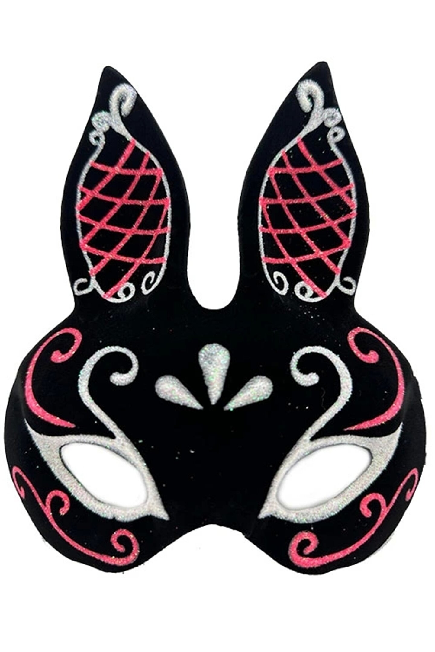 siyah renk kırmızı beyaz simli siyah süet kaplama tavşan maskesi 18x16 cm