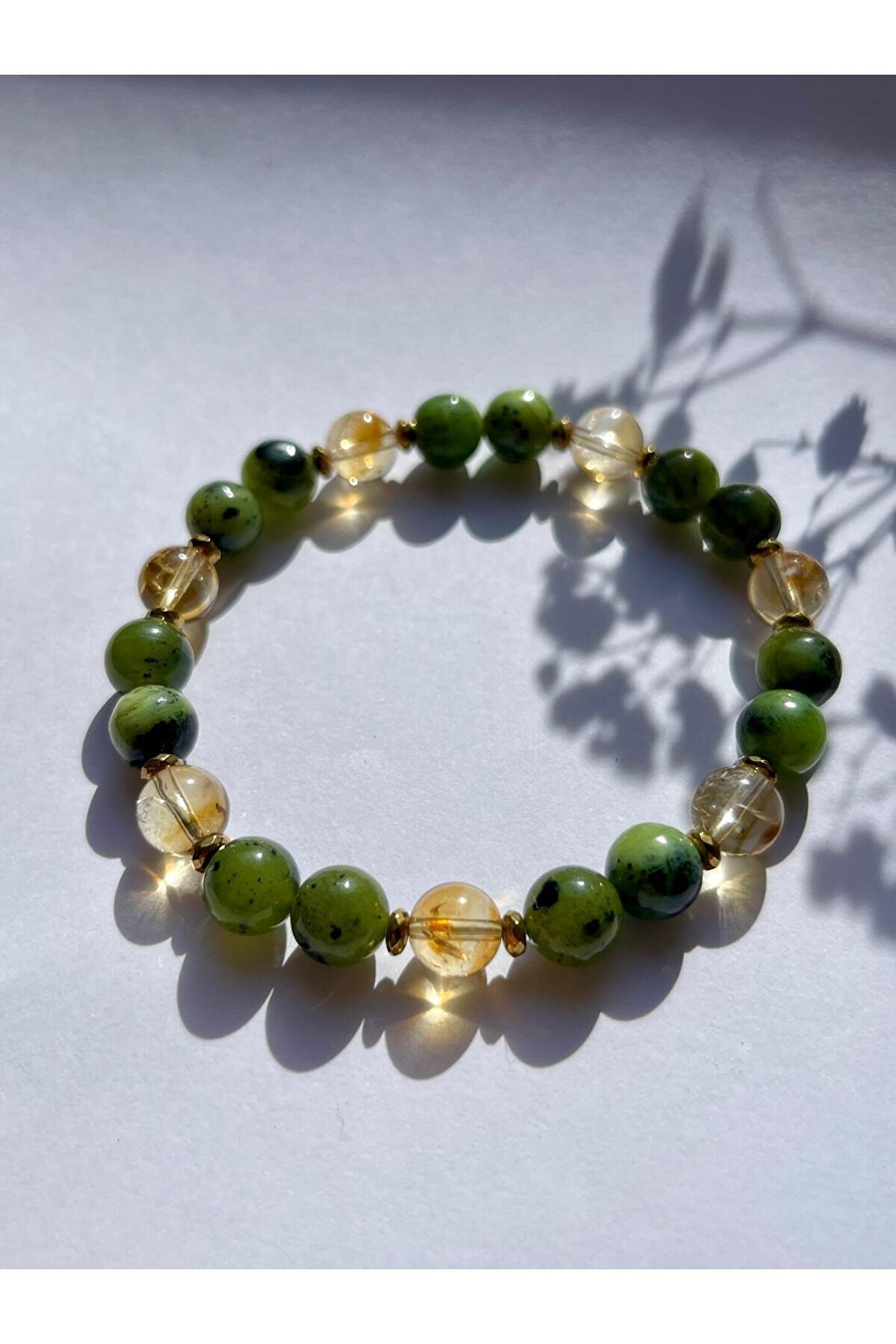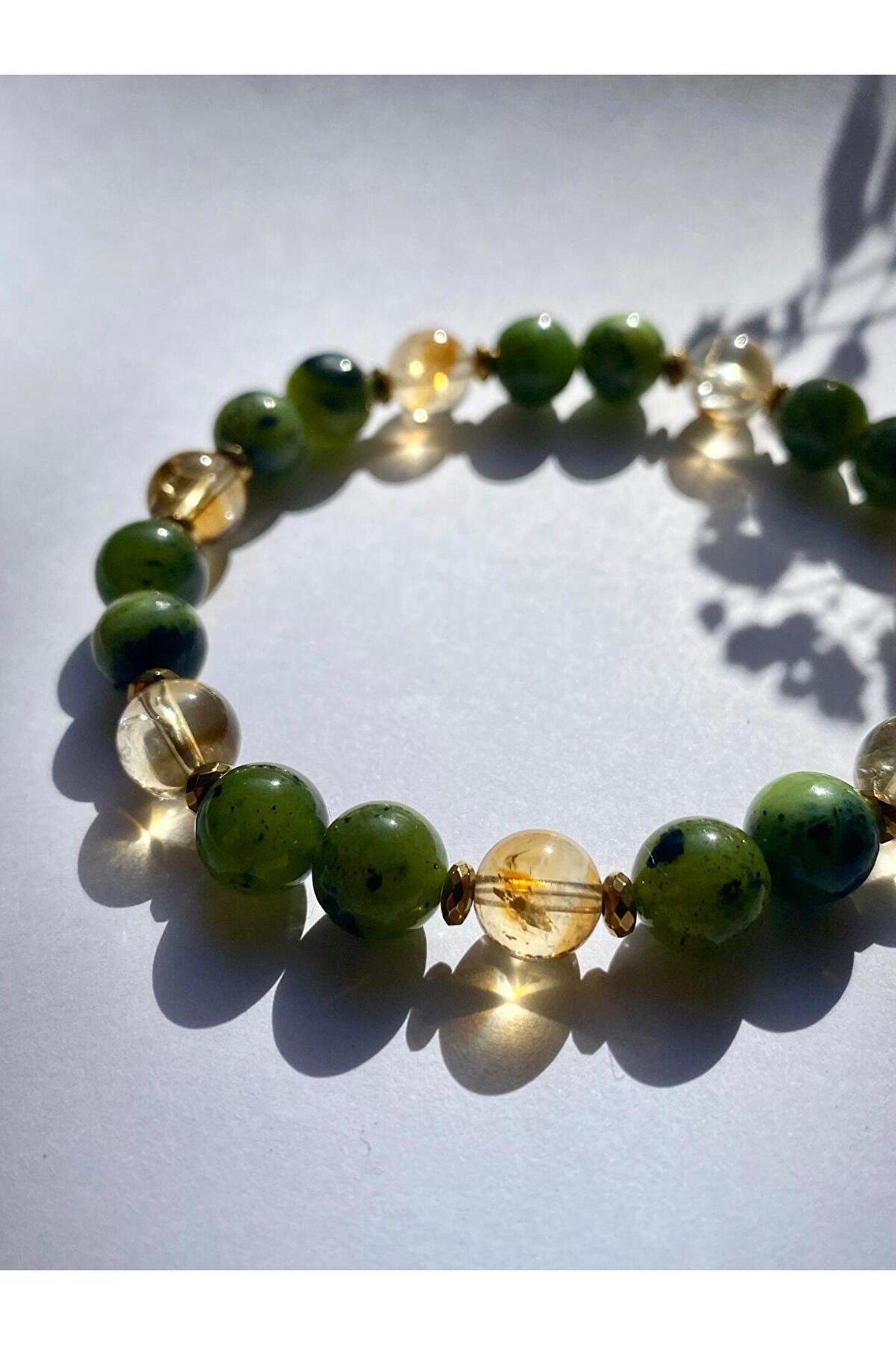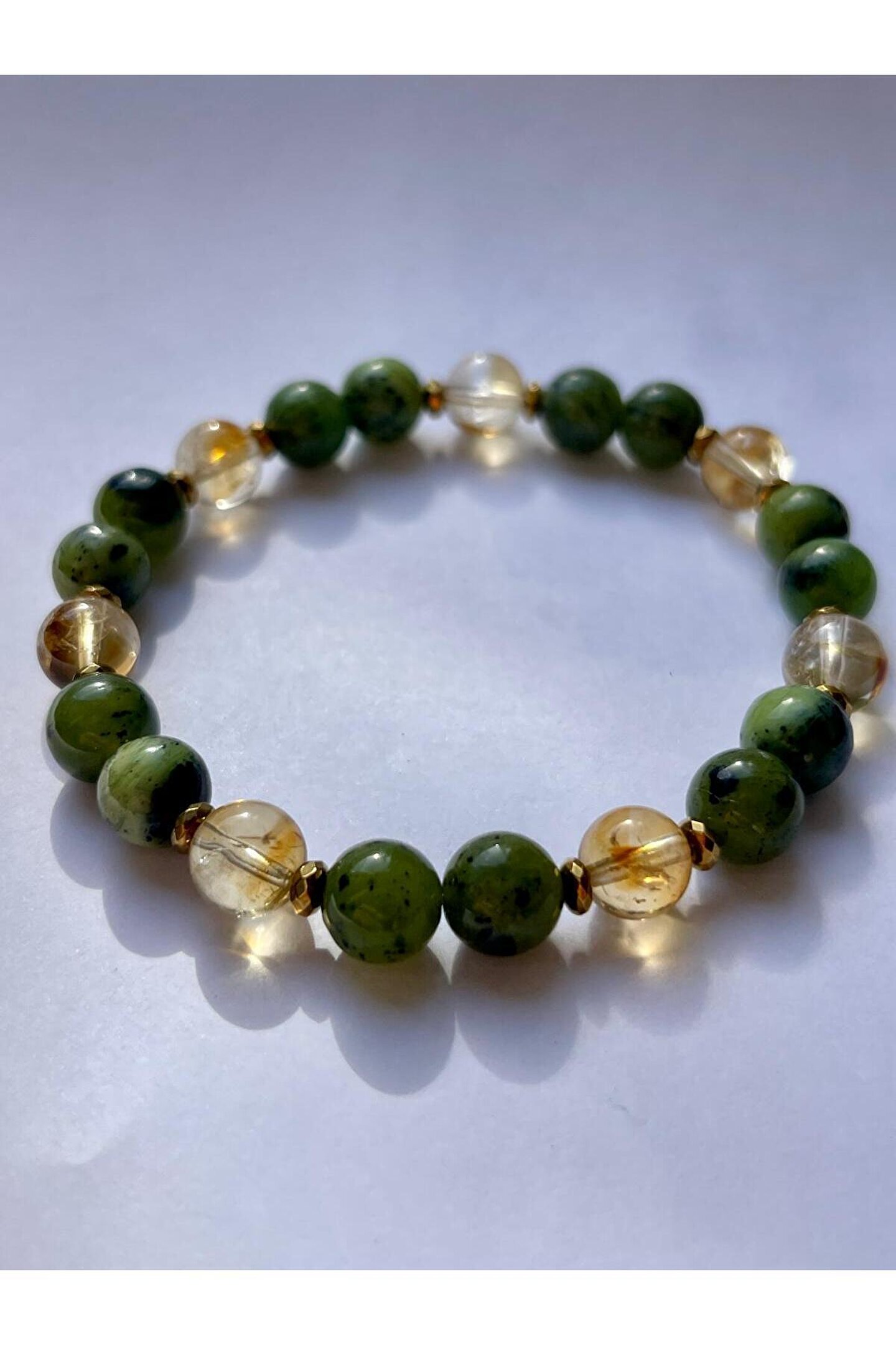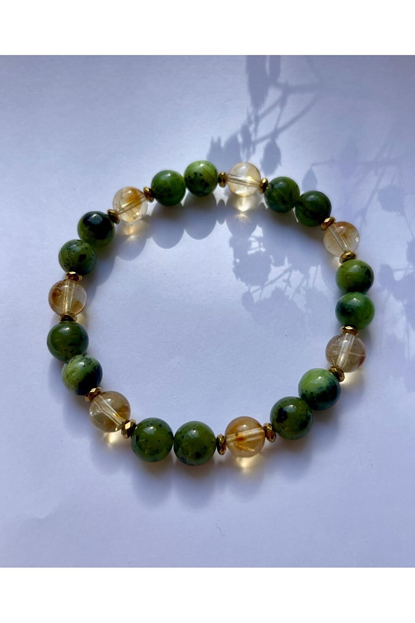 " Doğal taşlar yapısı gereği renk tonlarında ve damarlarında hafif farklılıklar gösterebilir.; " ; Yeşim taşının huzur veren enerjisi ve sitrinin bolluk çekme gücü ile tasarlanmış bir üründür.; ; Ürün Unisextir.; Çift bilekliği olarak da kullanabilirsiniz.; ; Aralarda kullanılan küçük aparatlar Hematit taşıdır.; ; Ürün doğal taştır.; ; Taş boyutu 8mm.